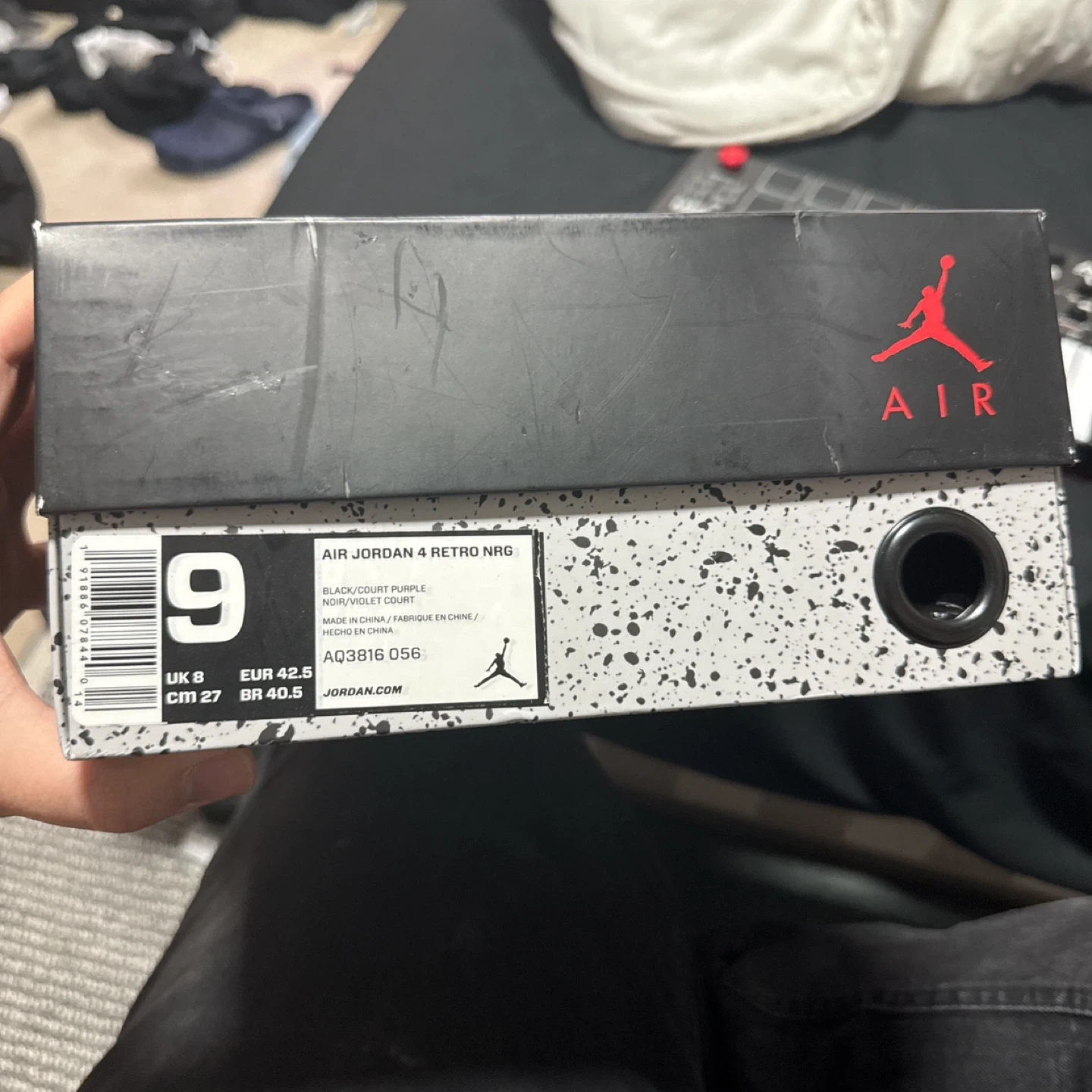 These are the Air Jordan 4 Retro NRG in the "Court Purple" colourway. Black suede uppers with vibrant purple accents on the midsole and heel tab. Includes original box.