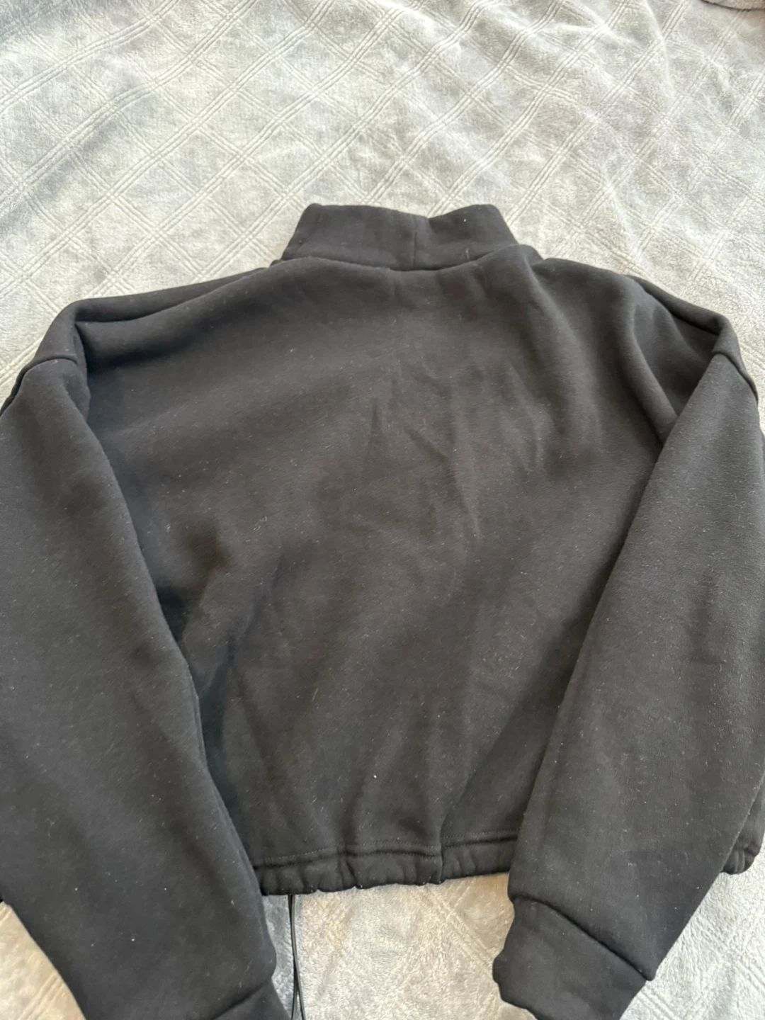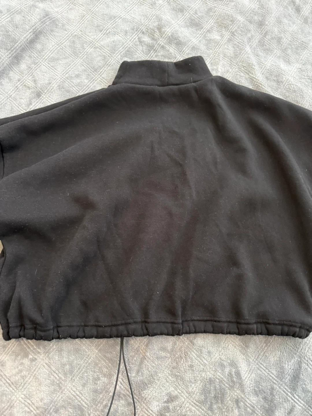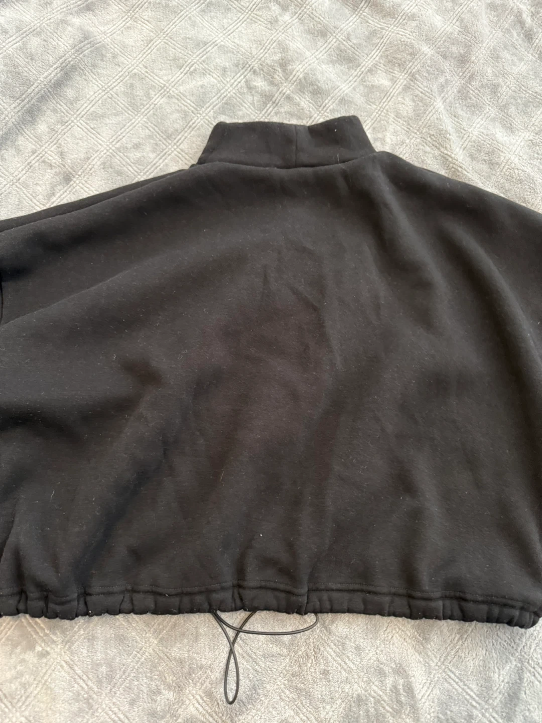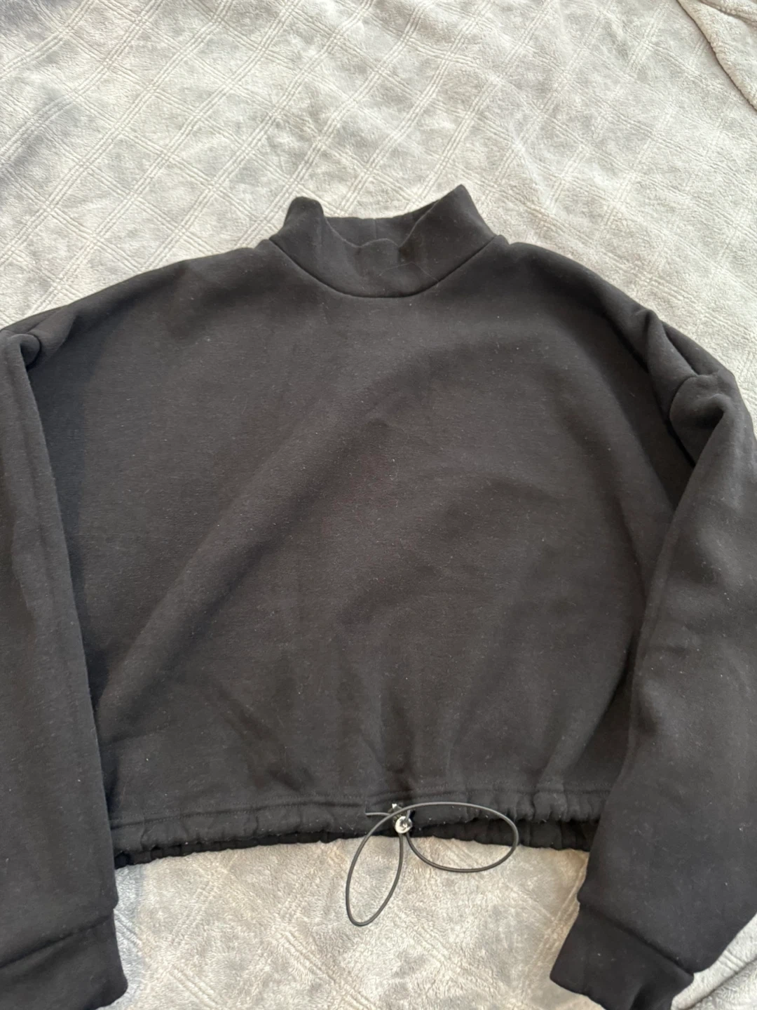 Black cropped sweatshirt with a mock neck and adjustable drawstring hem. Long sleeves. It's made of a soft fleece material. Size M