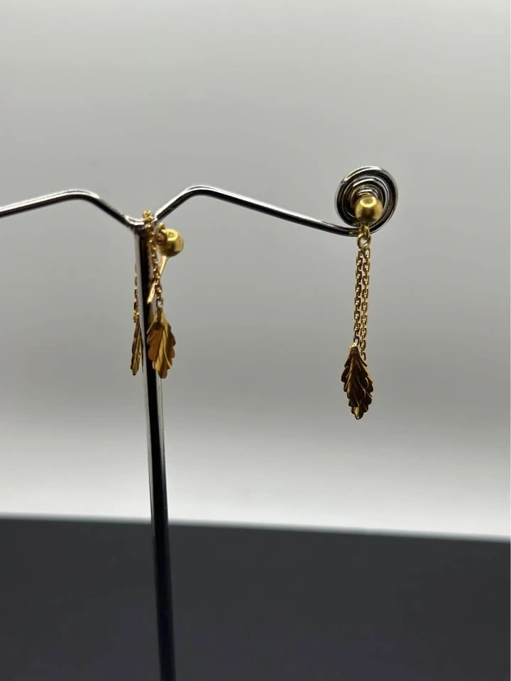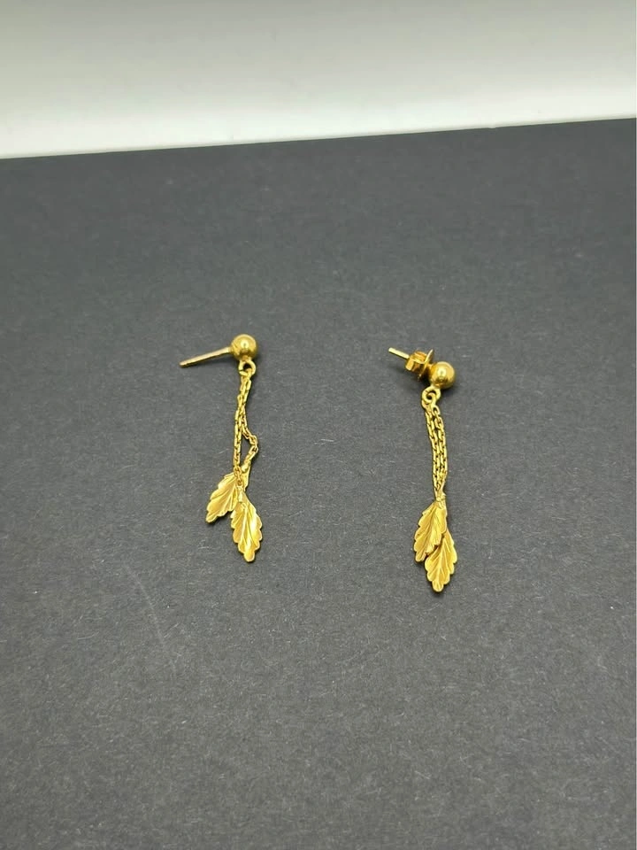Lovely pair of 18k gold leaf dangling earrings. One of the pair doesn’t have backs. Total weight is 2.87 grams.