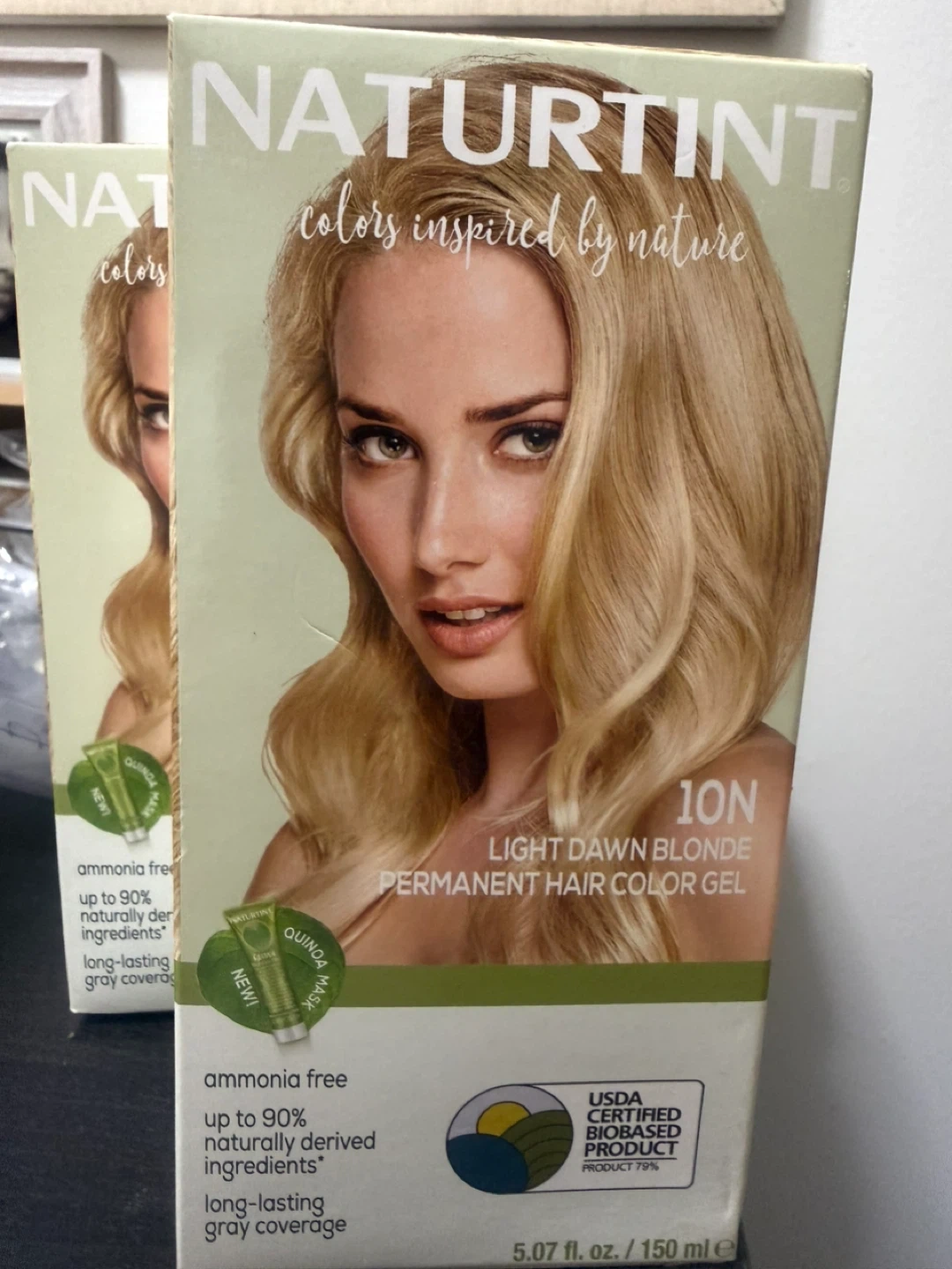 Naturtint permanent hair color gel in Light Dawn Blonde shade 10N. It's ammonia-free and made with up to 90% naturally derived ingredients. Offers long-lasting gray coverage and includes a quinoa mask. 5.07 fl oz / 150 ml.