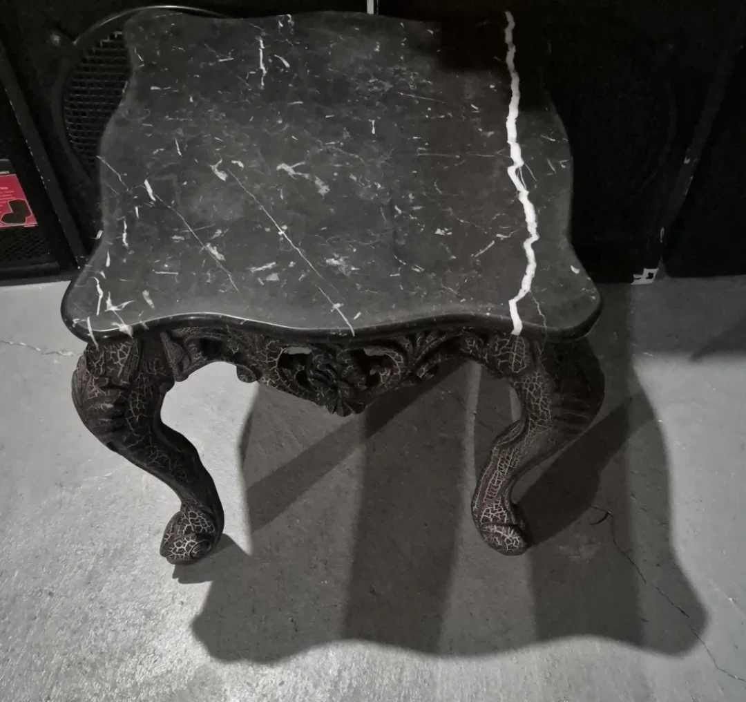 Set of 2 vintage side tables and coffee table with marble tops and intricate carved bases. These tables' unique design adds a dramatic flair to any room.