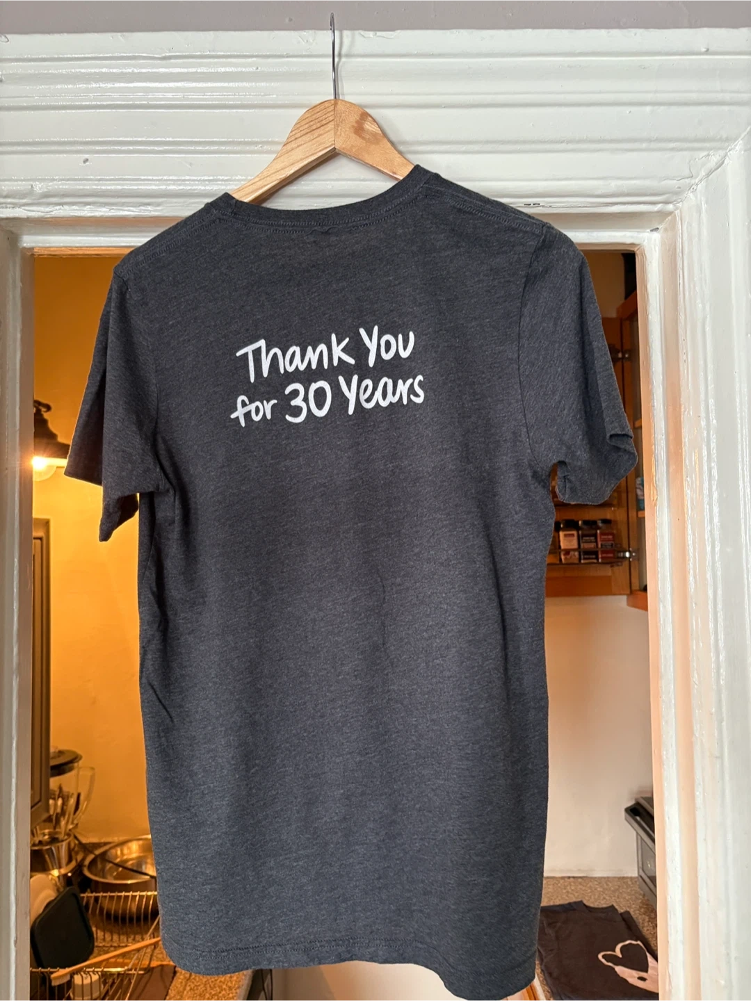 Charcoal gray tee with Levain 30th Anniversary image screen printed in white on front, and Thank You message on black. Men’s size medium, previously worn.
