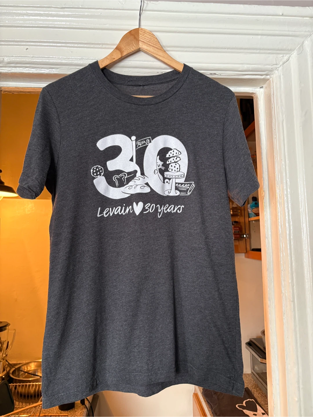 Charcoal gray tee with Levain 30th Anniversary image screen printed in white on front, and Thank You message on black. Men’s size medium, previously worn.