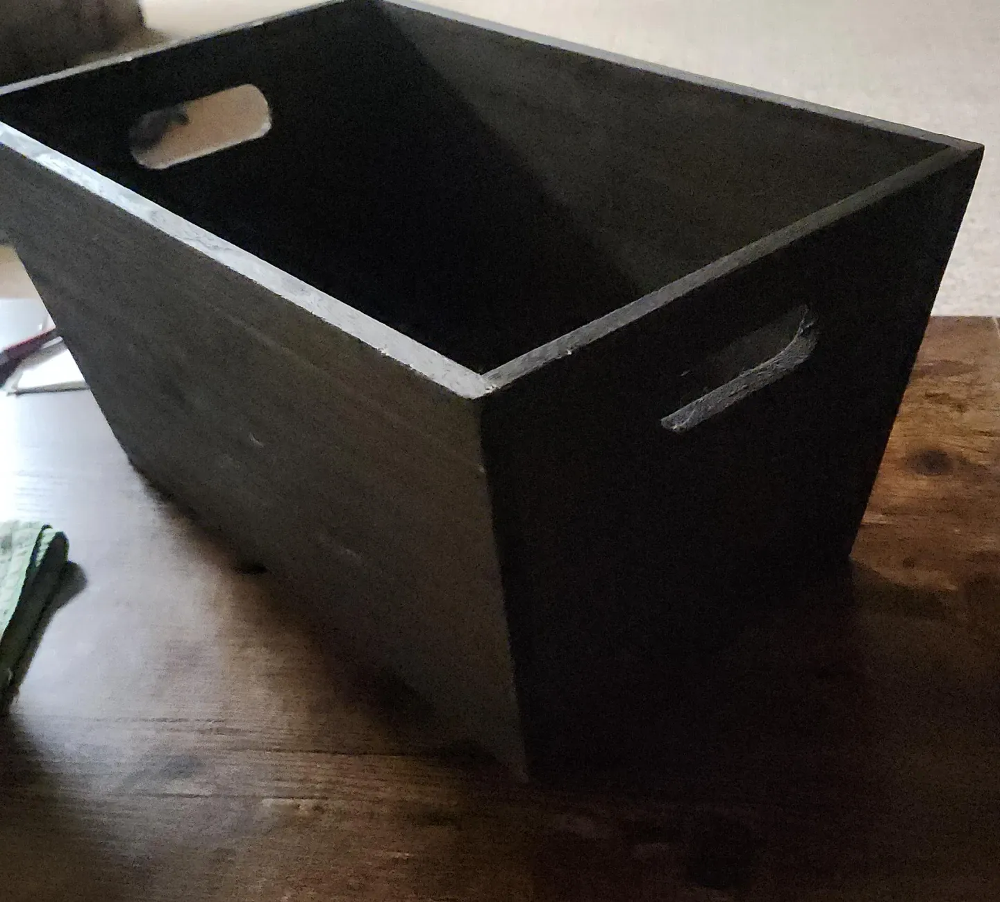 A dark-finished wooden bin with built-in handles for easy carrying. Its sturdy construction makes it great for organizing magazines, toys, or other household items. Wood material.