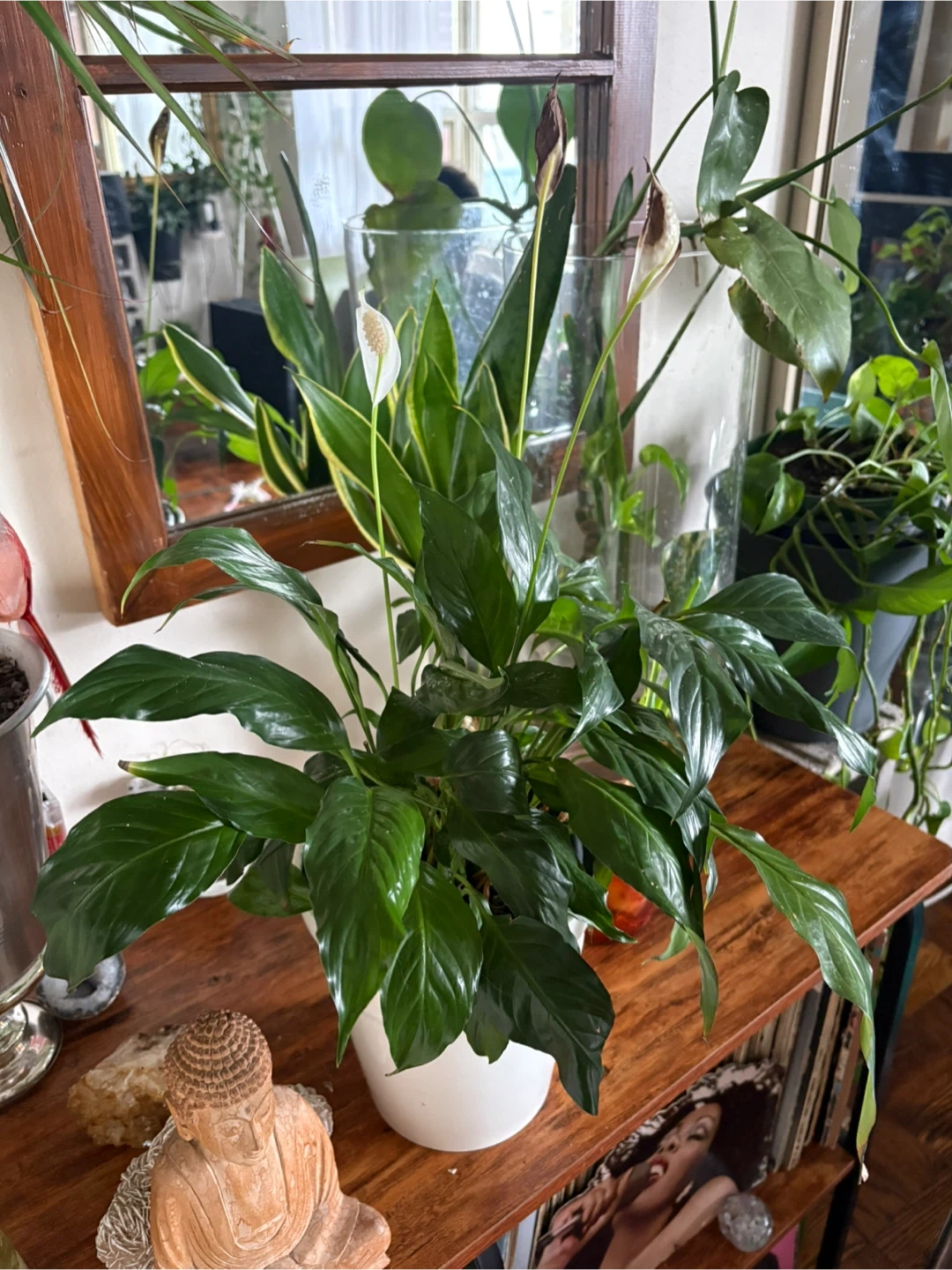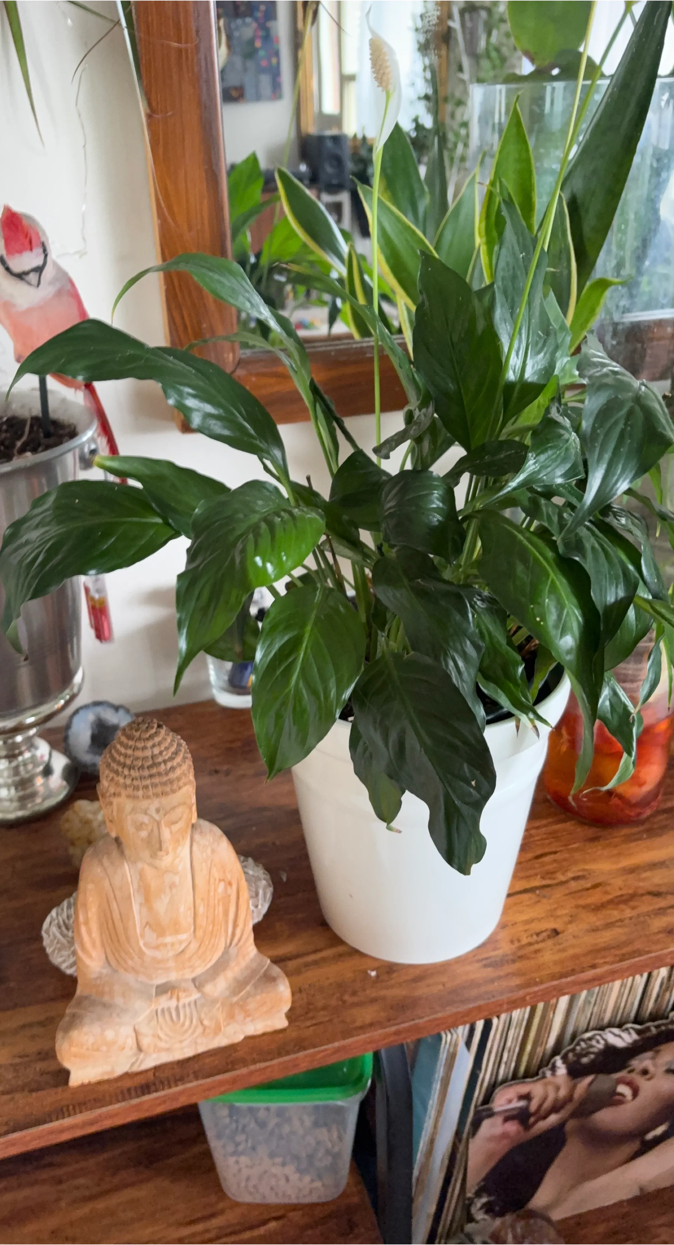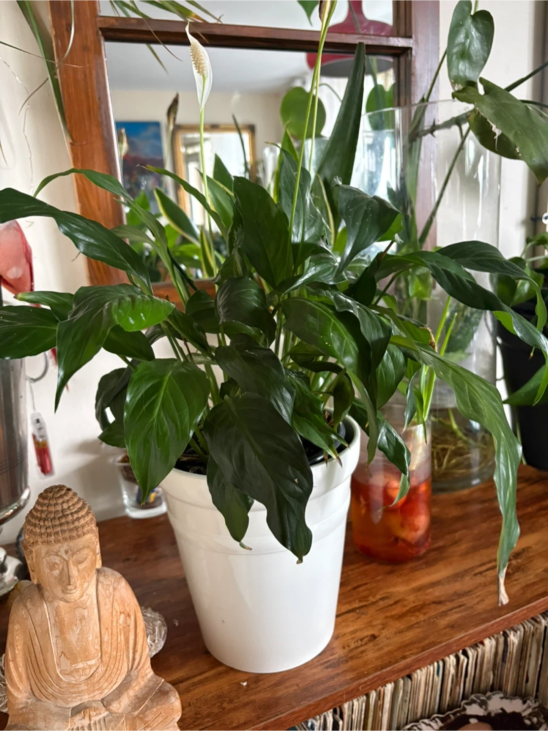 Healthy peace lily plant in a white pot. It's got glossy green leaves and is blooming. This plant is great for adding some natural greenery to your space. Easy to care for and purifies indoor air!