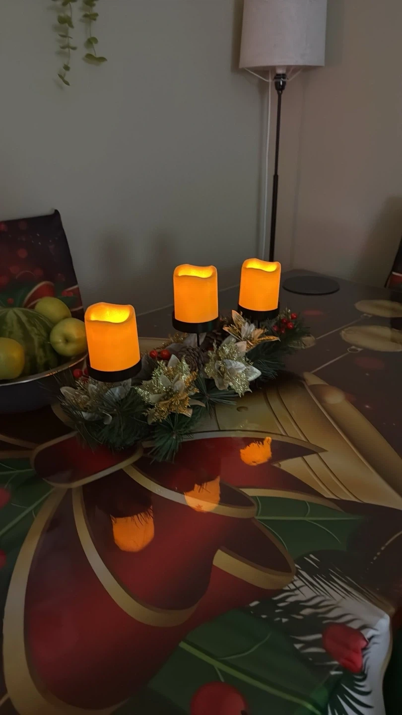 Set of three LED candles on a festive Christmas garland. Each candle emits a warm, flickering orange light. Perfect for adding a cozy glow to your holiday decor!