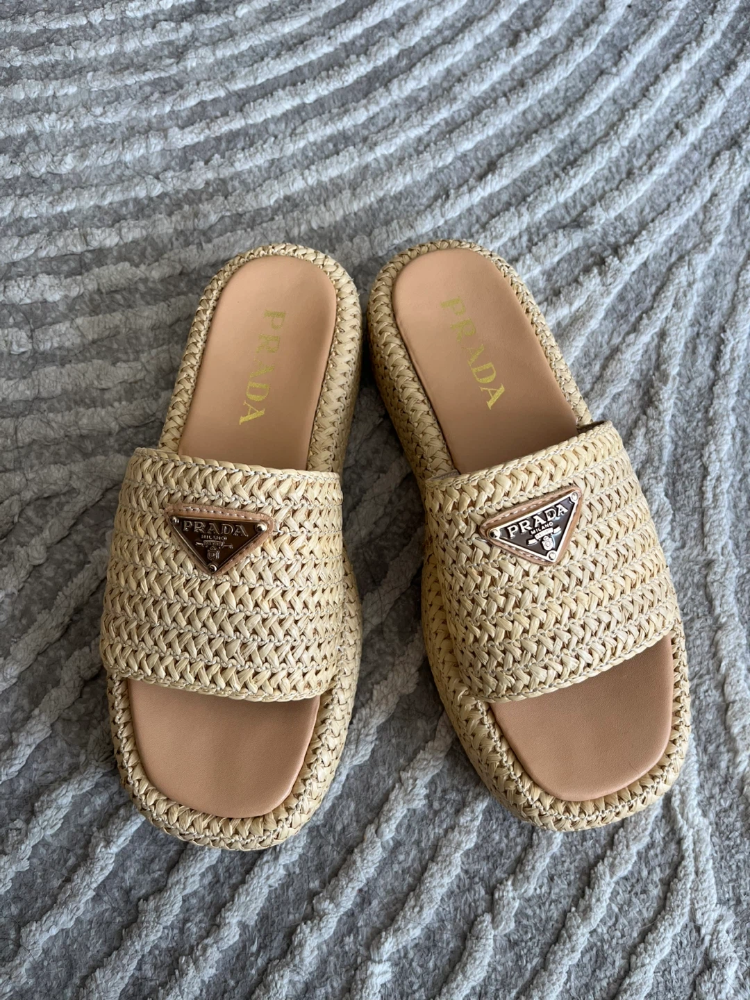 These Prada slides are crafted with a woven straw upper and a smooth leather insole. They feature the iconic Prada triangle logo on the strap. Perfect for warm weather strolls!