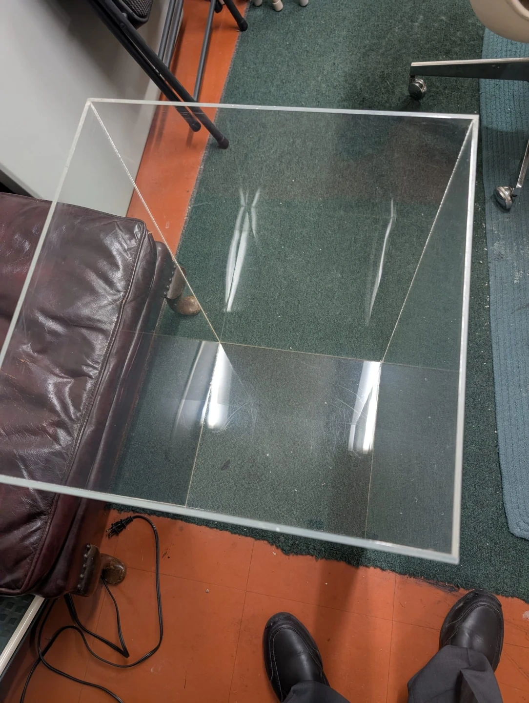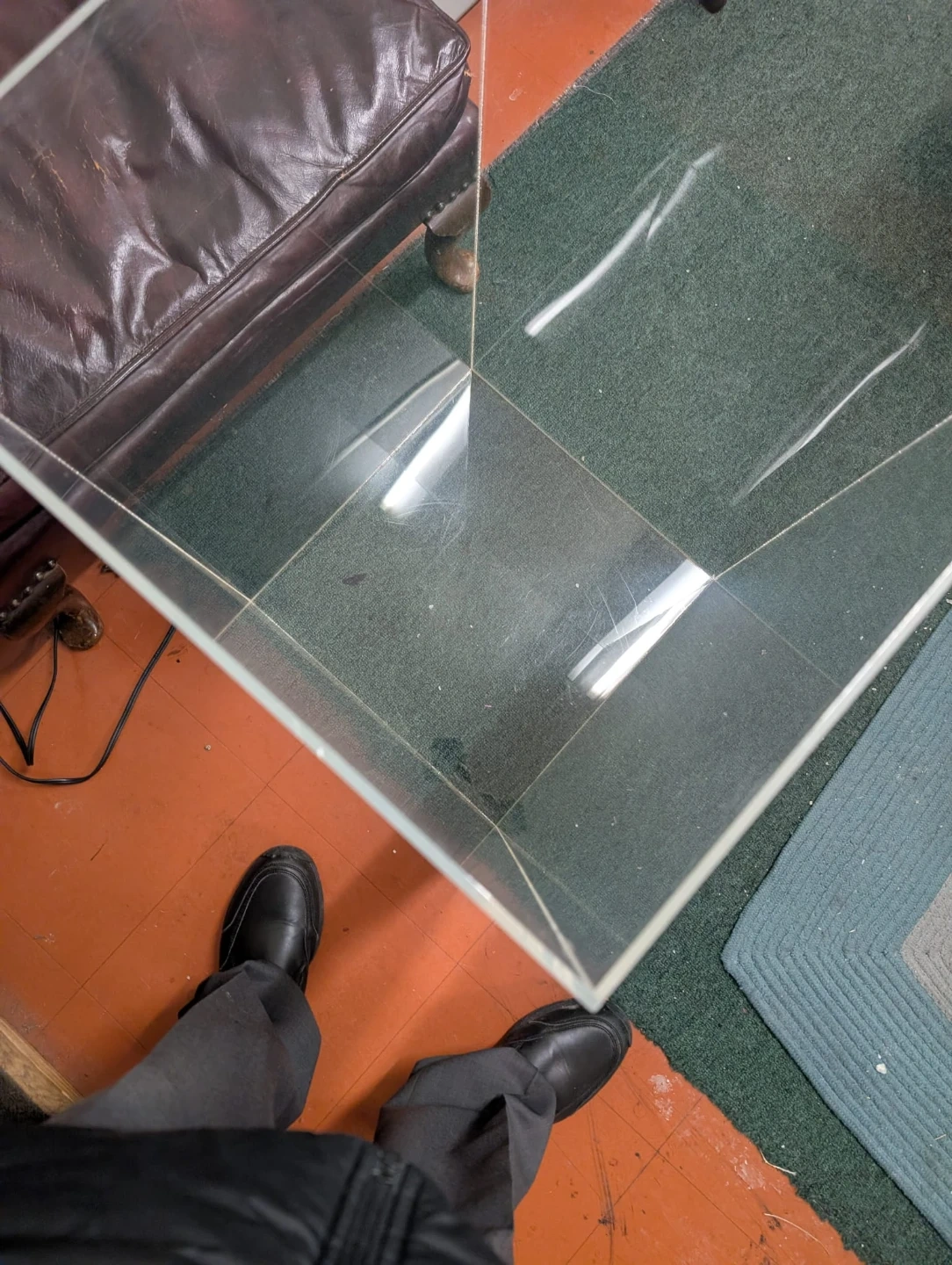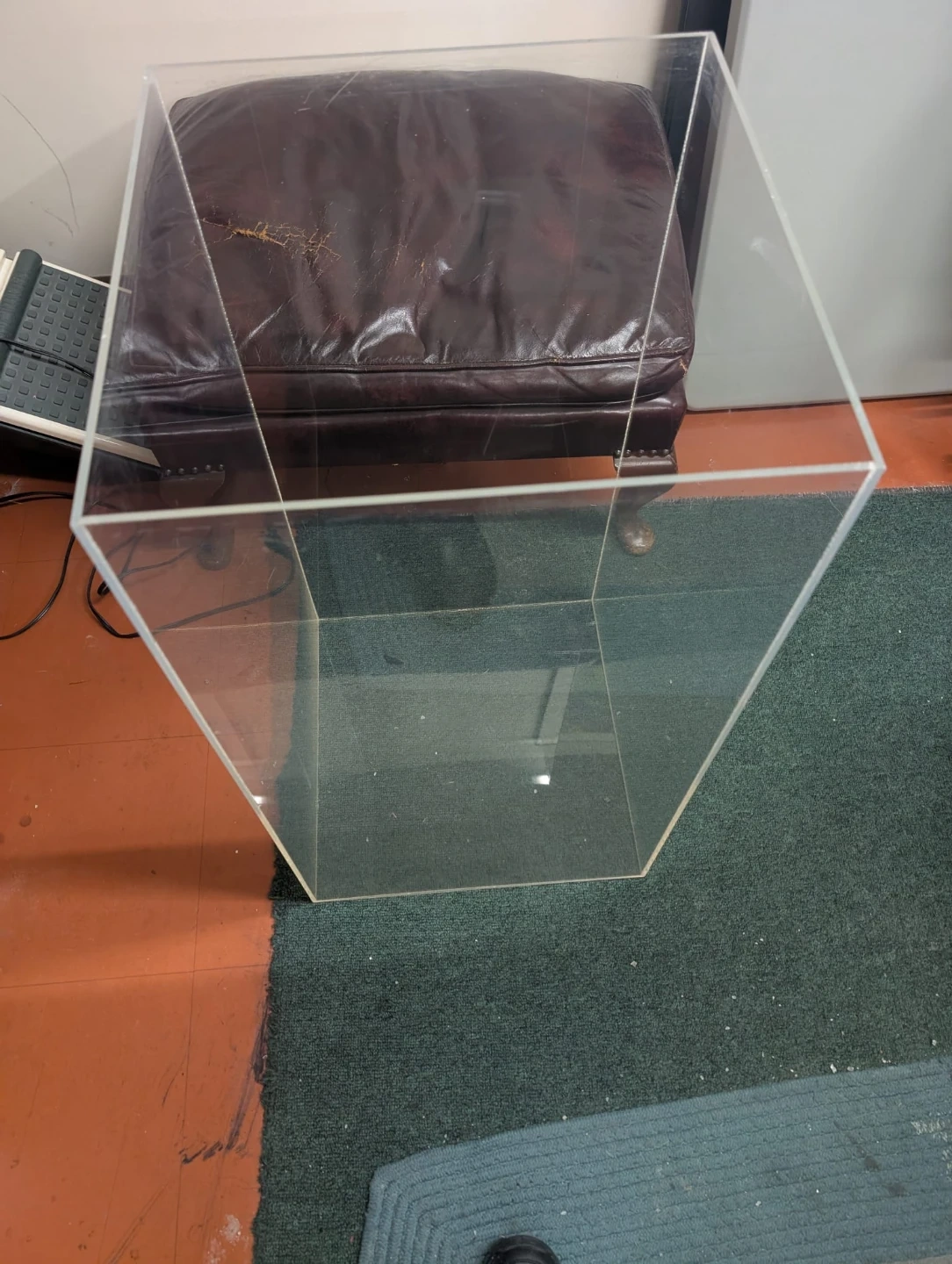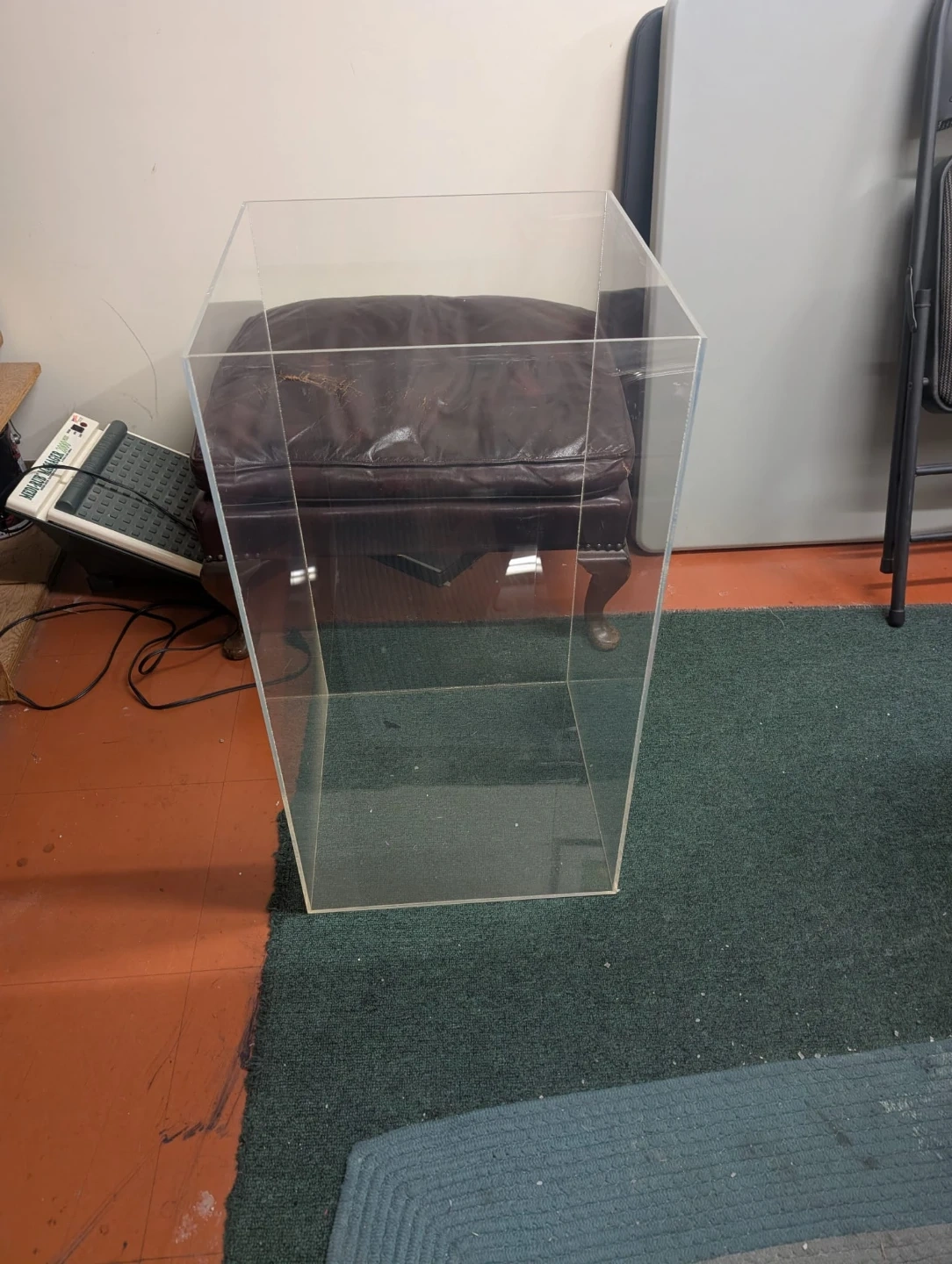 This is a clear acrylic display case. It measures approximately 15 inches in length, 15 inches in width, and 31 inches in height. It's a sturdy box for displaying items. This would be useful for showcasing collectibles or merchandise.