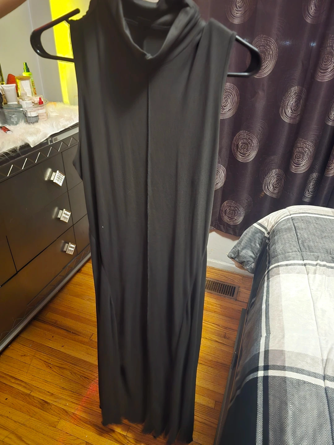 A long, sleeveless black maxi dress featuring a stylish turtleneck design. This dress is made from a comfortable, stretchy fabric. It's perfect for a night out or can be dressed down for a more casual look.