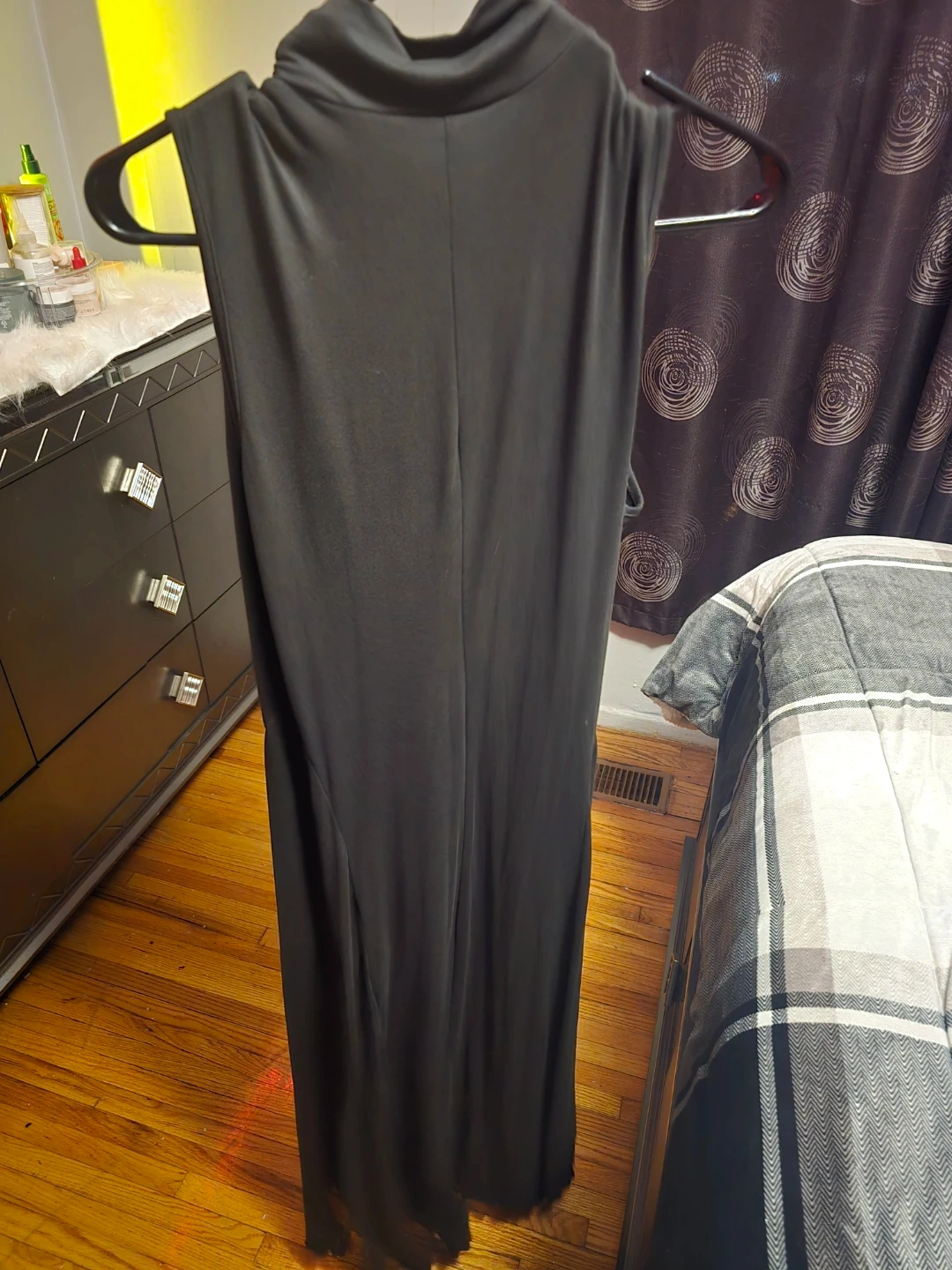 A long, sleeveless black maxi dress featuring a stylish turtleneck design. This dress is made from a comfortable, stretchy fabric. It's perfect for a night out or can be dressed down for a more casual look.