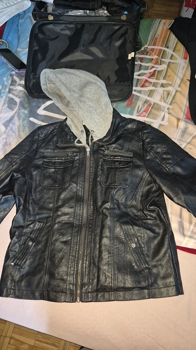 Selling a black leather jacket with a grey hood. It's in great condition and has a stylish look. Barley worn and ready to be sold
