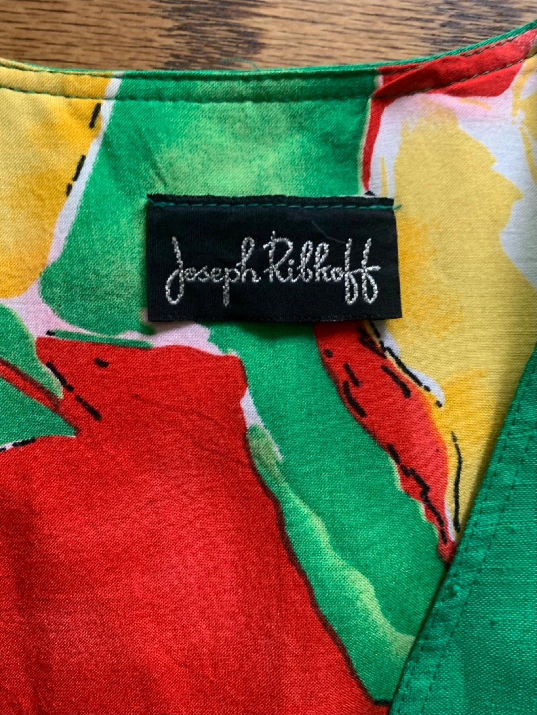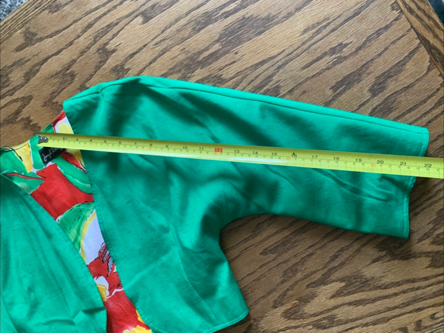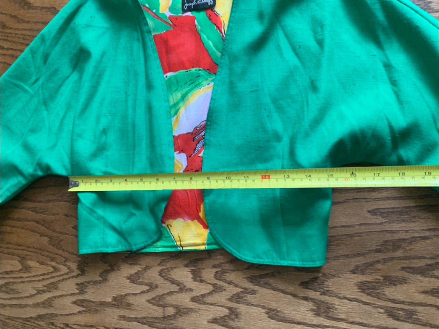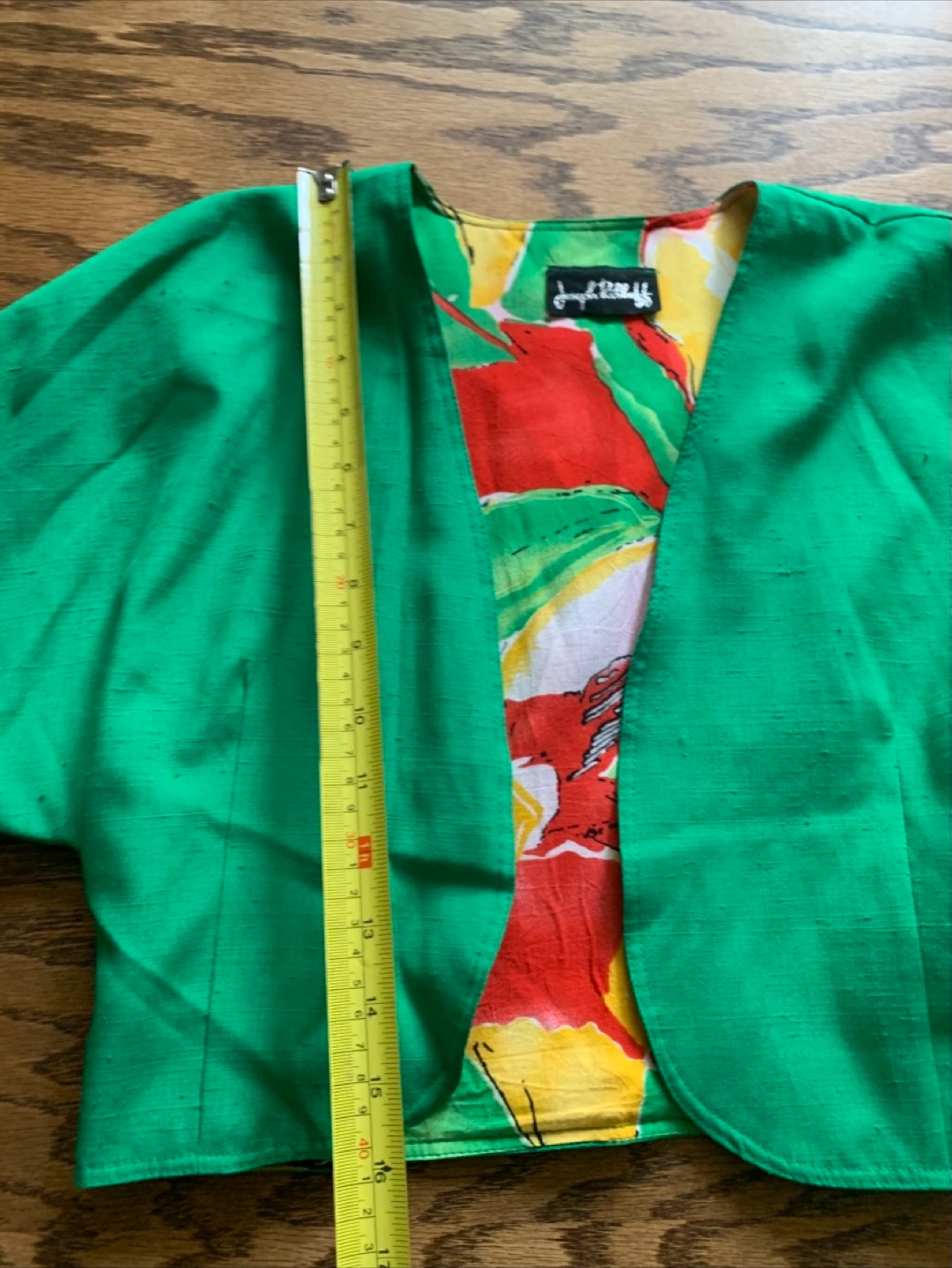 This is a gently used green bolero jacket from Joseph Radcliff. It features a colourful floral lining. The jacket measures approximately 19 inches across the front.