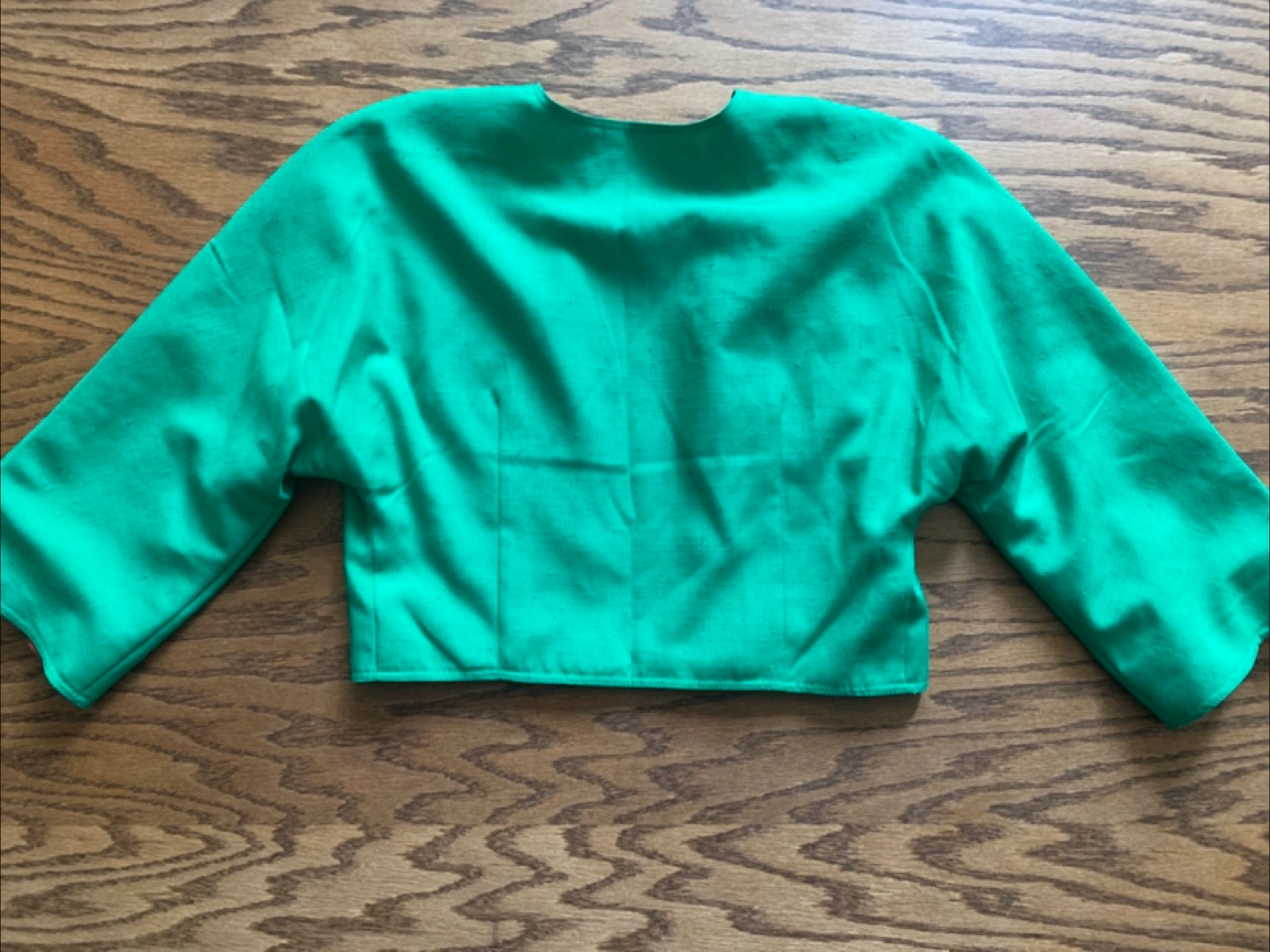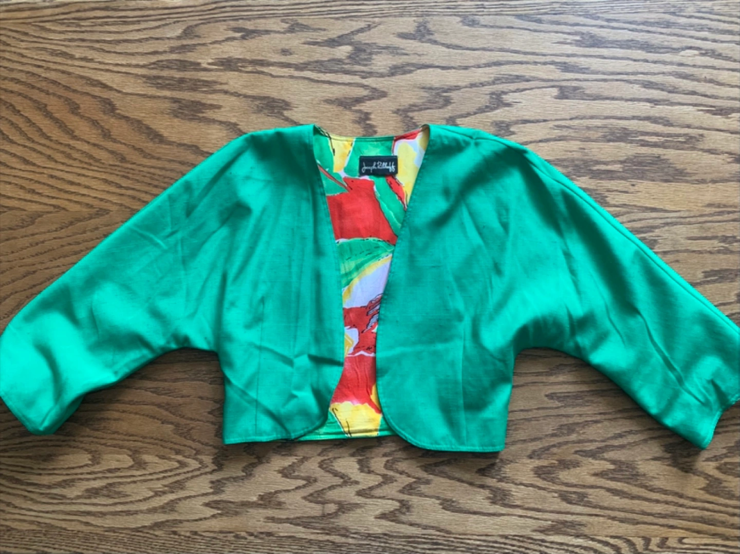 This is a gently used green bolero jacket from Joseph Radcliff. It features a colourful floral lining. The jacket measures approximately 19 inches across the front.