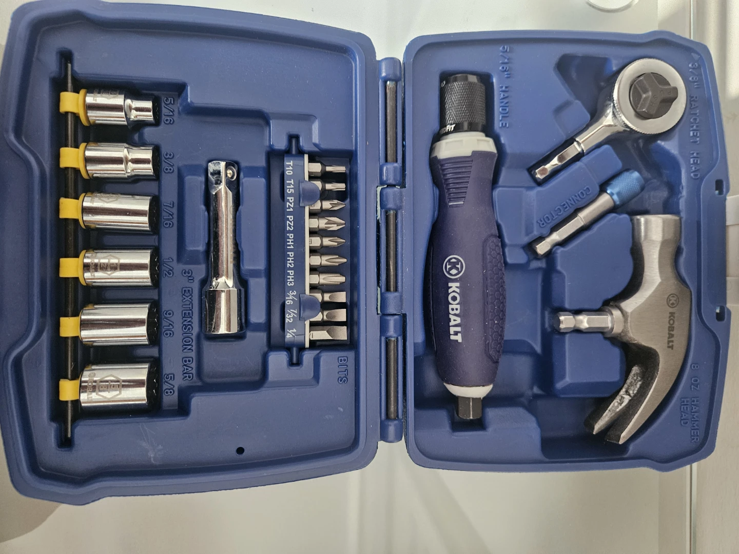 This is a Kobalt 24-piece socket and screwdriver set. It includes a ratcheting screwdriver handle, a 3" extension bar, and various bits and sockets. It also has a small claw hammer attachment.