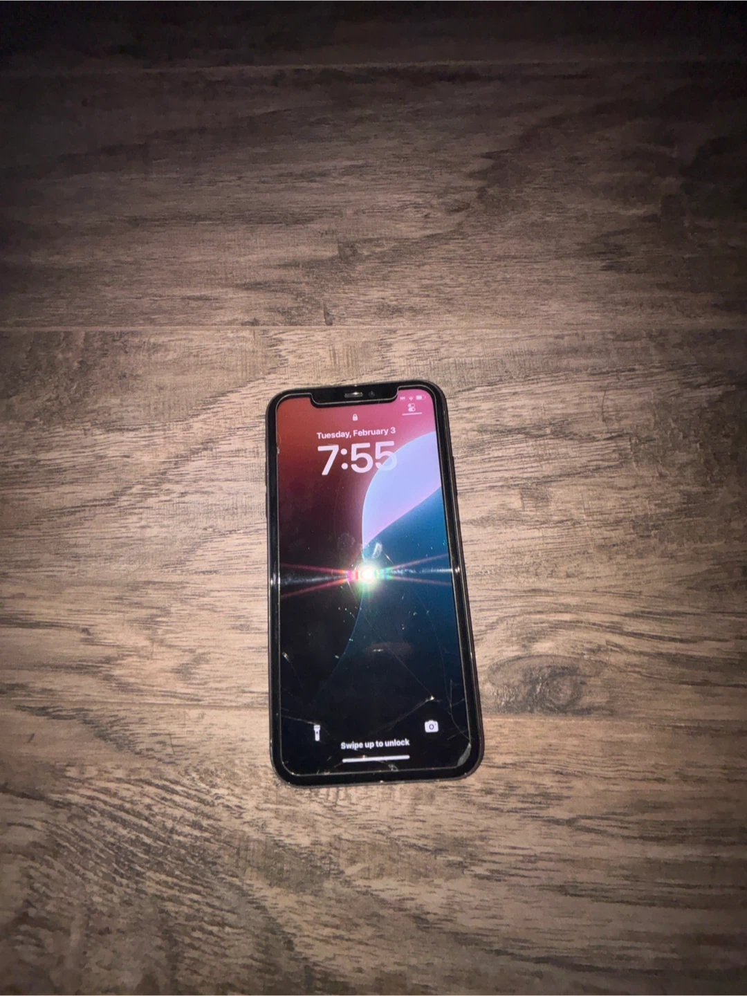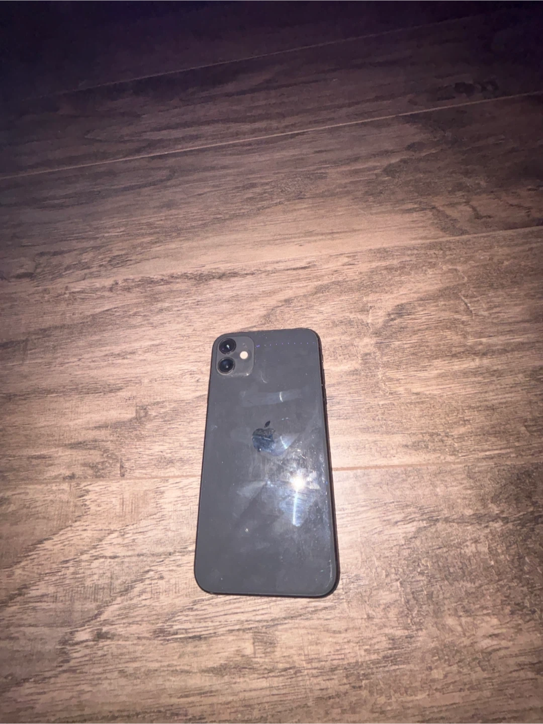 Apple iPhone 11 in dark grey. It has a 6.1-inch display. The phone's screen has some visible scratches, but it's still functional. It features a dual-camera system.