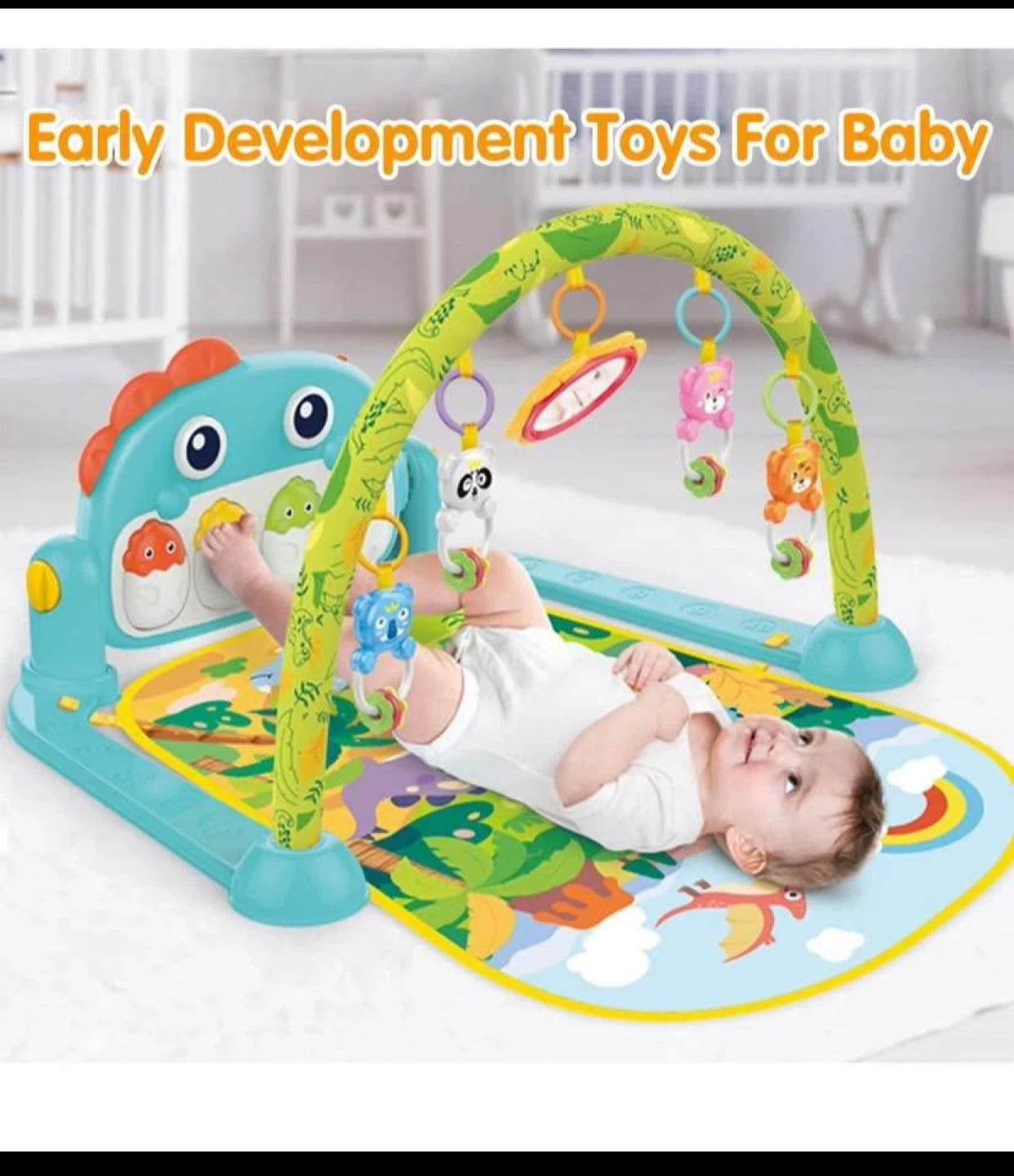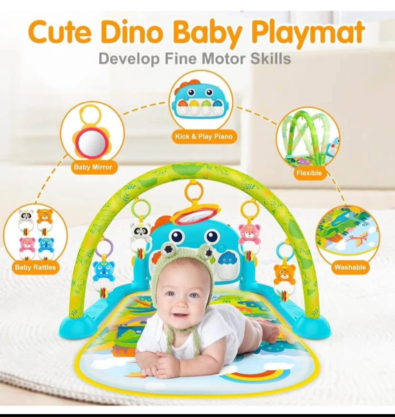 This cute dino baby playmat is perfect for your little one's early development! It's a musical gym playmat that grows with your baby from newborn to toddler. It helps develop fine motor skills with features like a baby mirror, kick & play piano, baby rattles, and is also washable. It's designed to improve concentration, sensory development, colour perception, and hand-eye coordination. It keeps them busy and entertained for a while with tummy time, take-along, lay & play, and sit & play options