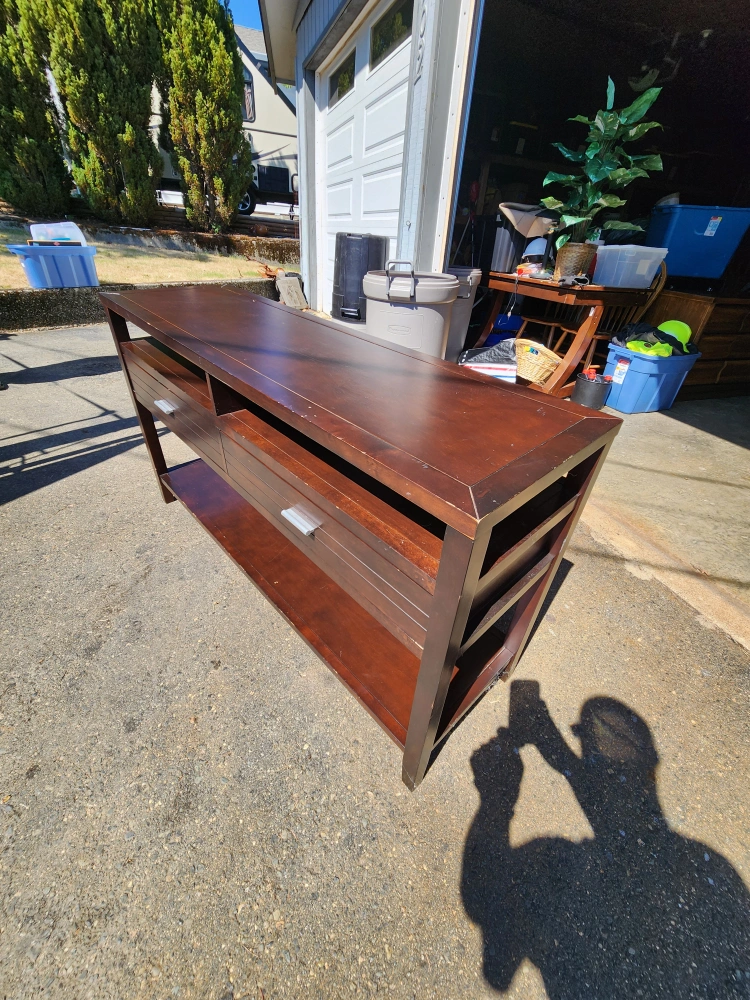 Here's a brown wood TV stand or console table. It features a shelf and drawers for storage.