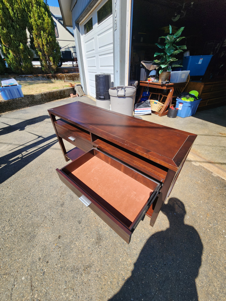 Here's a brown wood TV stand or console table. It features a shelf and drawers for storage.