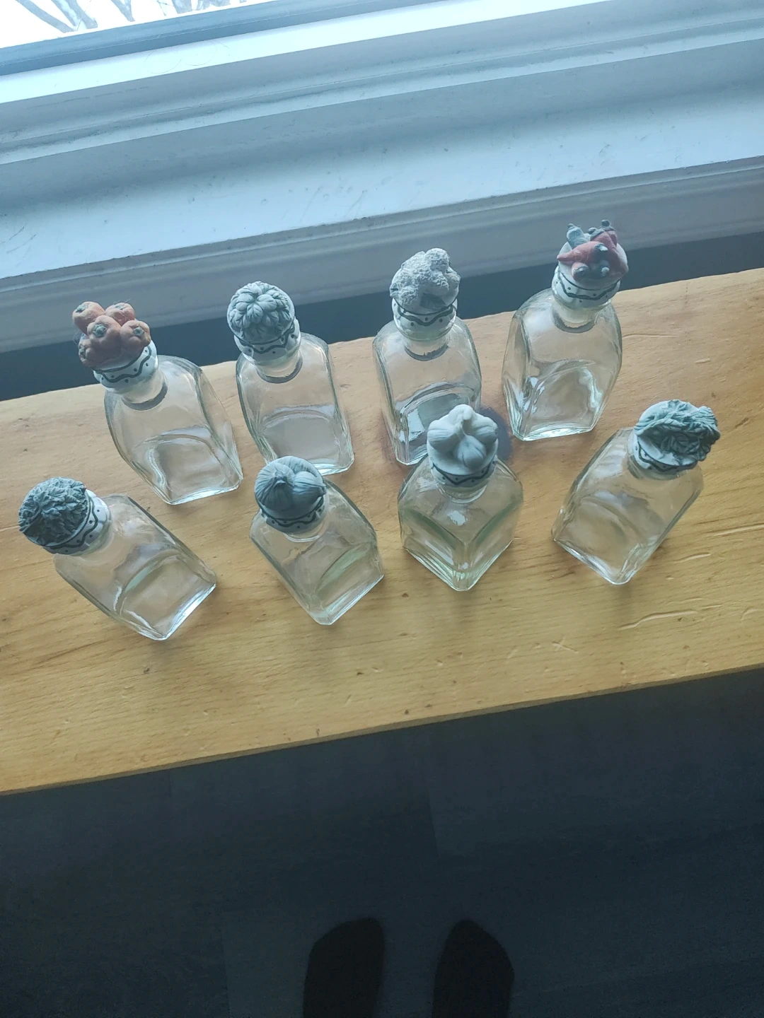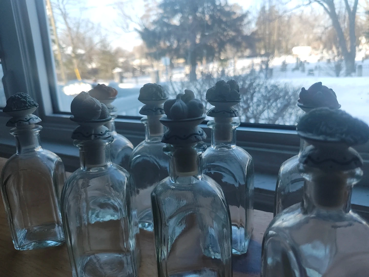 Eight glass spice bottles with decorative stoppers Each bottle has a unique, textured stopper.