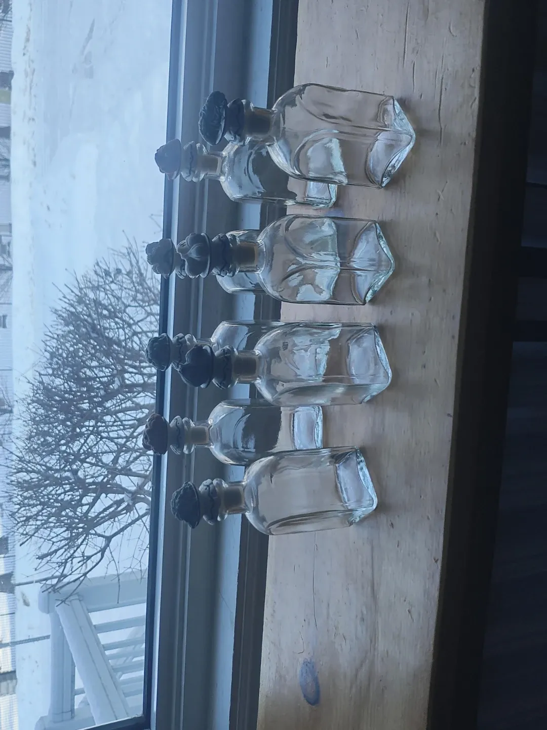 Eight glass spice bottles with decorative stoppers Each bottle has a unique, textured stopper.