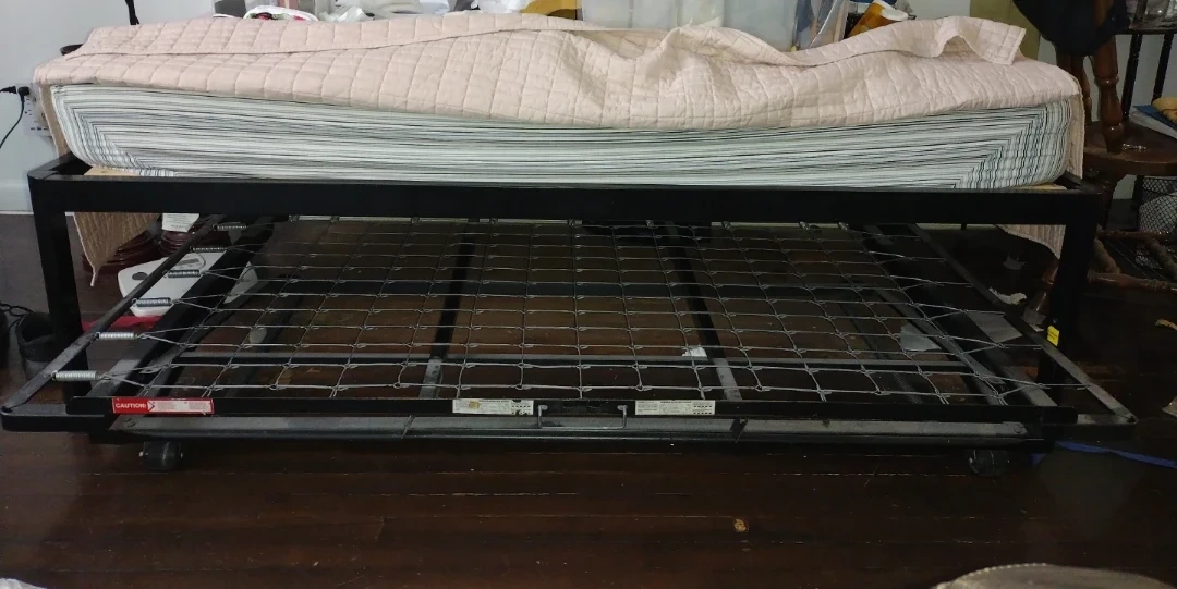 Twin Bed Frame with Mattress and Trundle. Metal rollaway bed frame with a mattress. It's a twin size bed. The mattress is included with the frame.