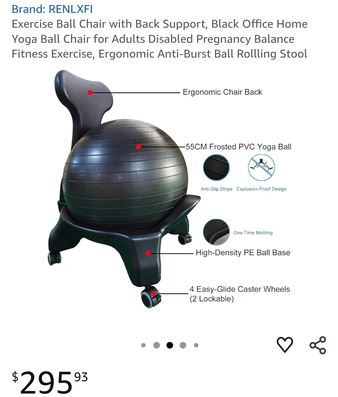 This is an exercise ball chair with a back support. It features a 55CM frosted PVC yoga ball and a high-density PE ball base. The chair has 4 easy-glide caster wheels, with 2 being lockable.