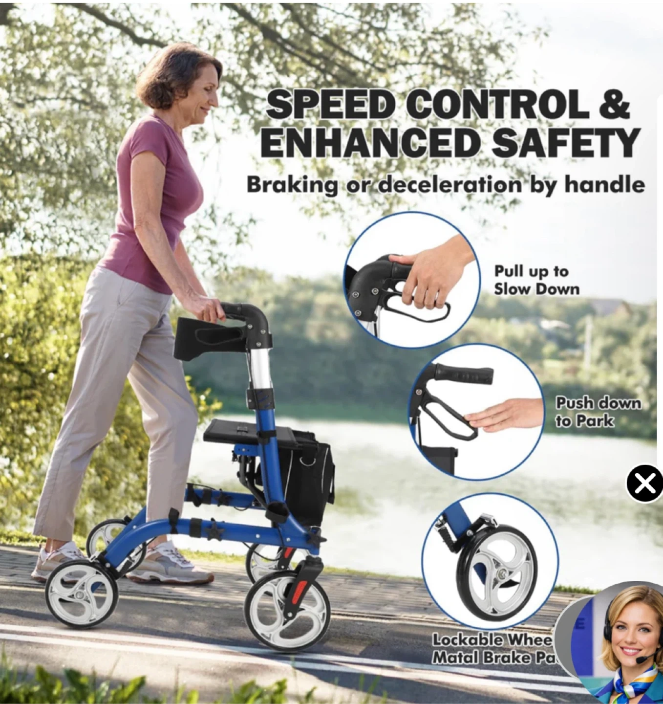 Blue 4-wheel walker with adjustable height and a built-in seat and storage bag. It features a lockable brake system for speed control and parking. Supports up to 330 lbs. Ideal for users between 5'4" and 6'1".