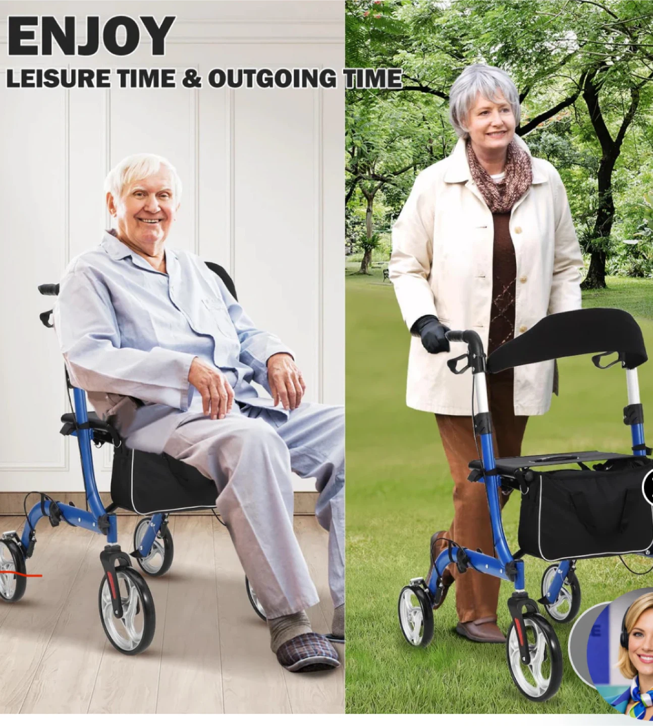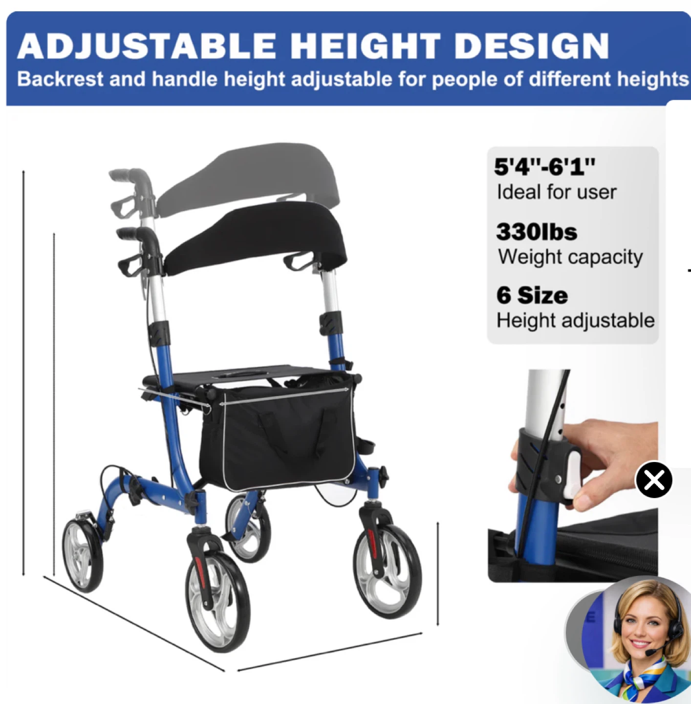 Blue 4-wheel walker with adjustable height and a built-in seat and storage bag. It features a lockable brake system for speed control and parking. Supports up to 330 lbs. Ideal for users between 5'4" and 6'1".