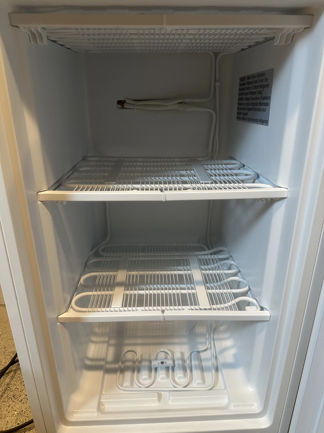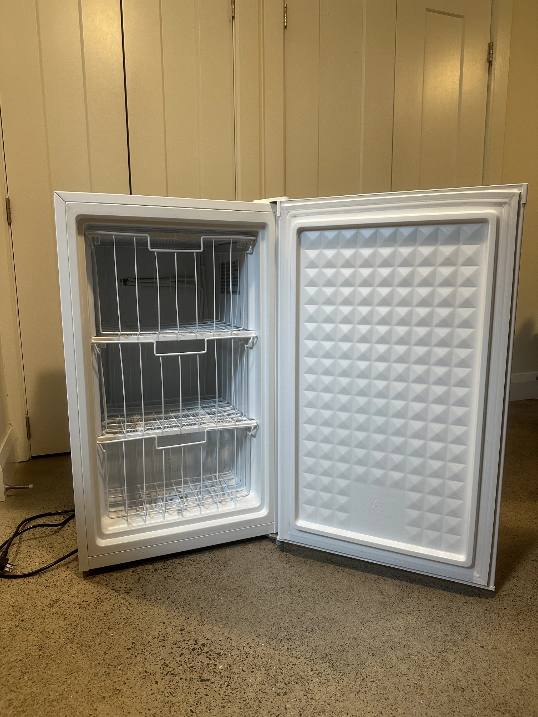 3.0 cu ft upright freezer with adjustable thermostat, reversible door. Includes 3 removable storage baskets, a scraper & instructions.