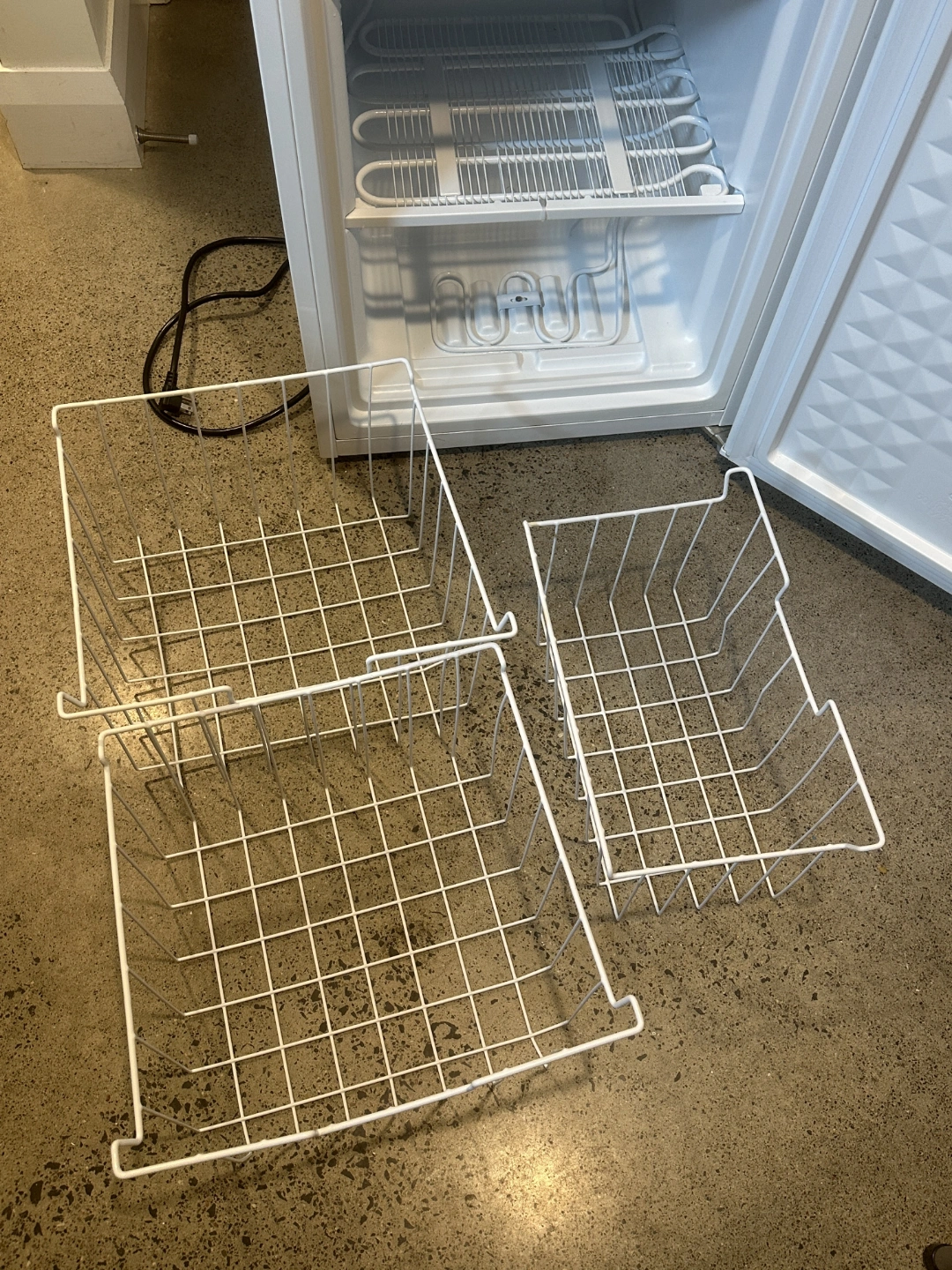 3.0 cu ft upright freezer with adjustable thermostat, reversible door. Includes 3 removable storage baskets, a scraper & instructions.