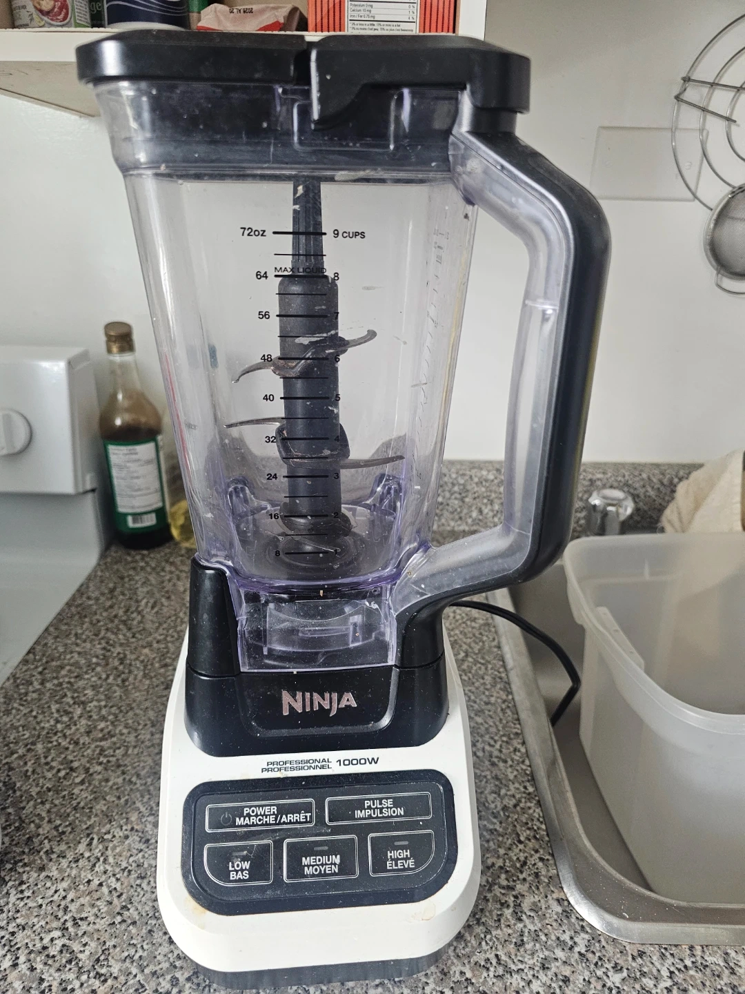 Ninja Professional 1000W blender. It has settings for power, pulse, low, medium, and high speeds. The pitcher is marked up to 72oz or 9 cups.