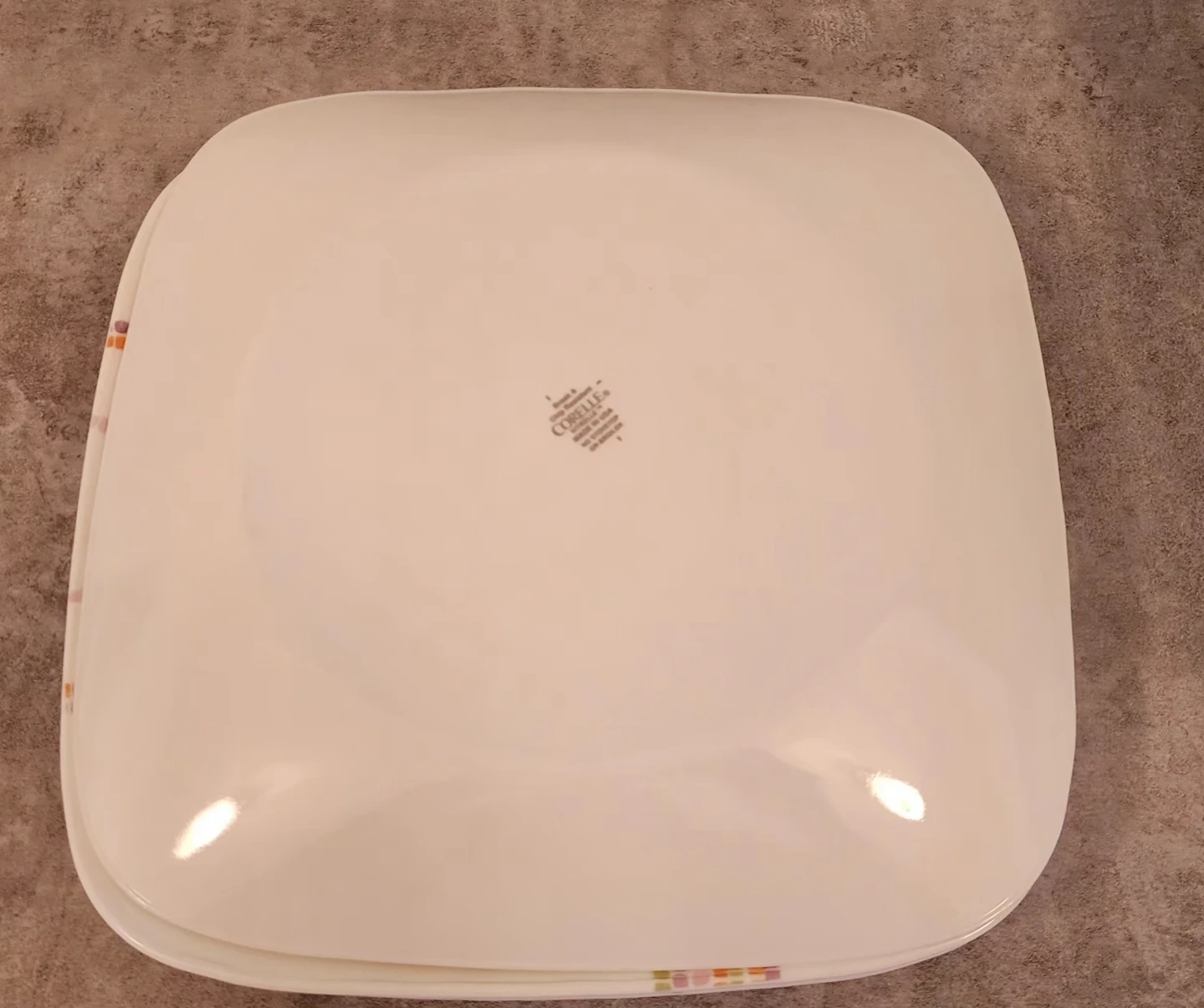 Set of four Corelle square dinner plates featuring a colourful mosaic stripe design. These durable plates are made from tempered glass for long-lasting use. Dishwasher and microwave safe. Great for everyday meals or entertaining!