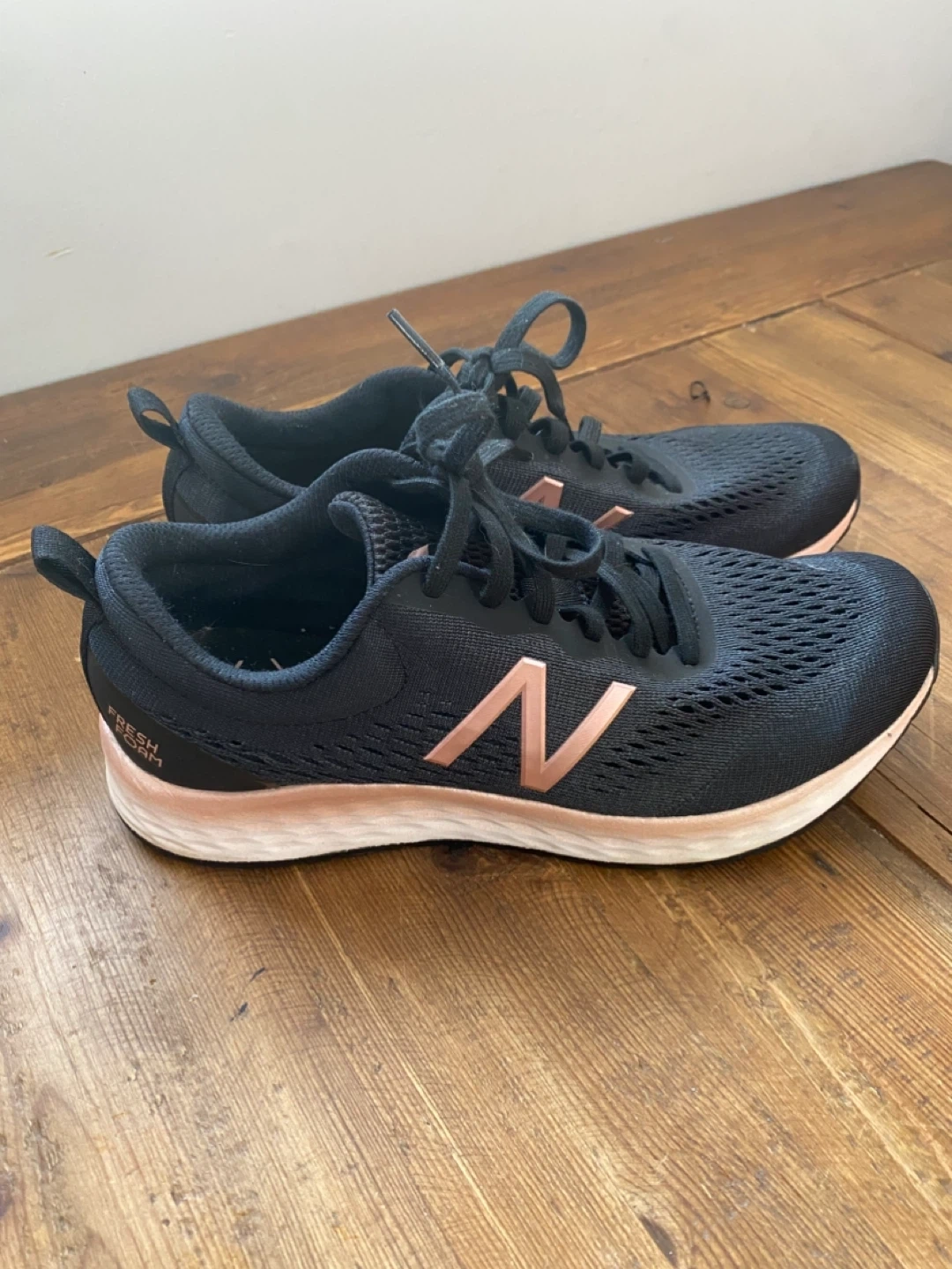 These black New Balance running shoes feature rose gold accents and Fresh Foam technology for comfort. The mesh upper offers breathability. They're suitable for road running or everyday wear.
