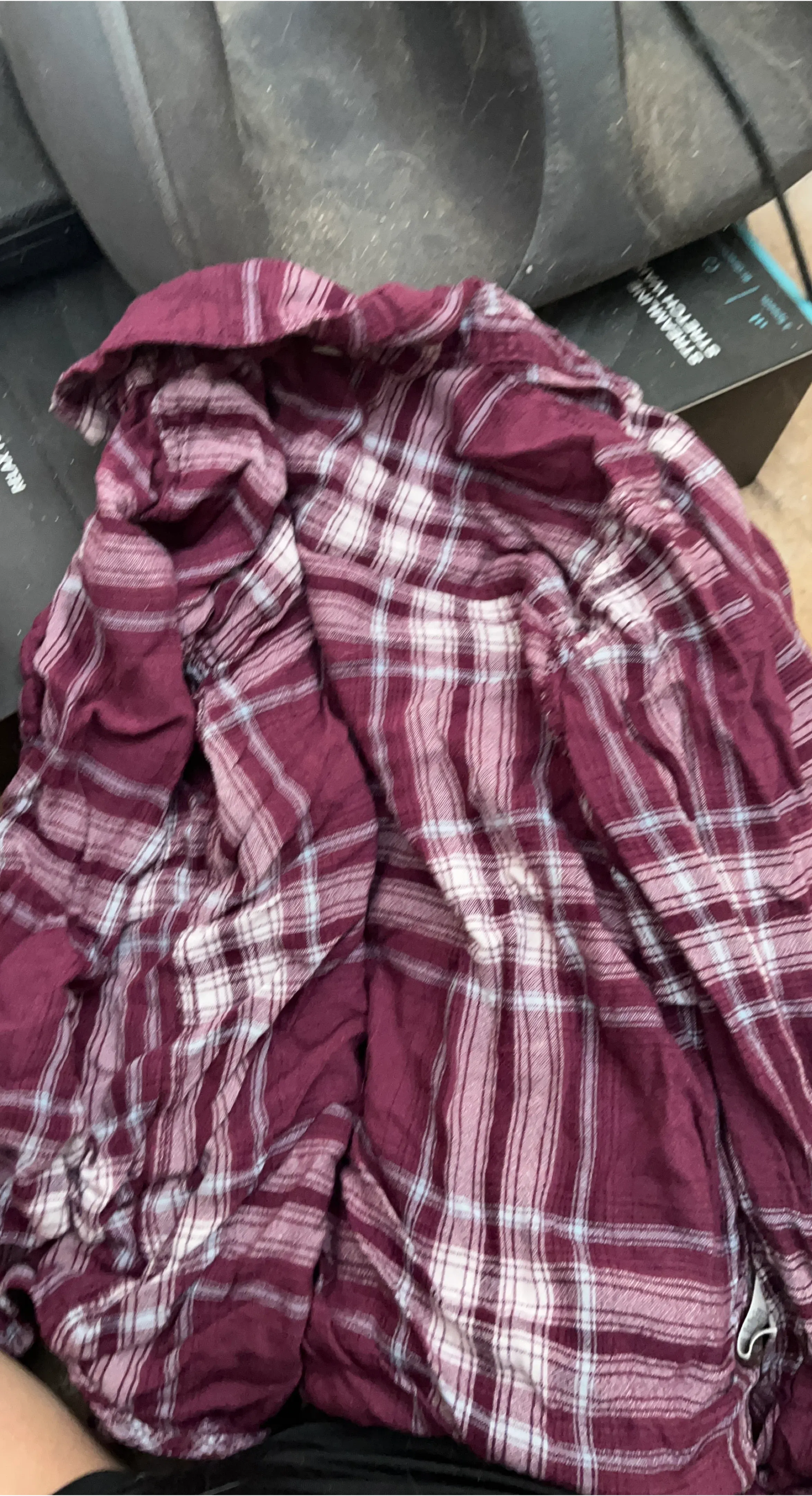 Here's a burgundy plaid flannel shirt. It's in good condition and ready for a new home! The material is soft and comfortable, perfect for layering or wearing on its own. The plaid pattern is classic and versatile, making it a great addition to any wardrobe