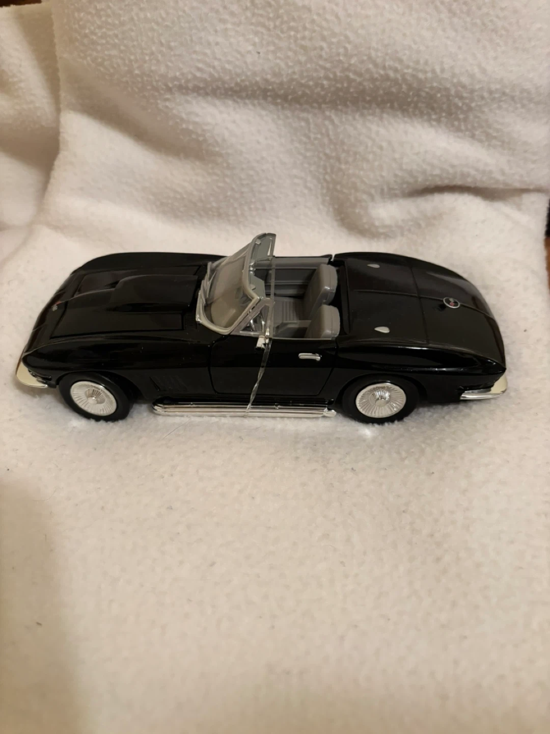 This is a vintage black, die-cast 1967 convertible corvette toy car. It has chrome accents and detailed interior. Great for collectors. 1:24 I have two in black one in red listed separately each are $40 I have the motor max box that held four I only have three who ever buys all three can have the box