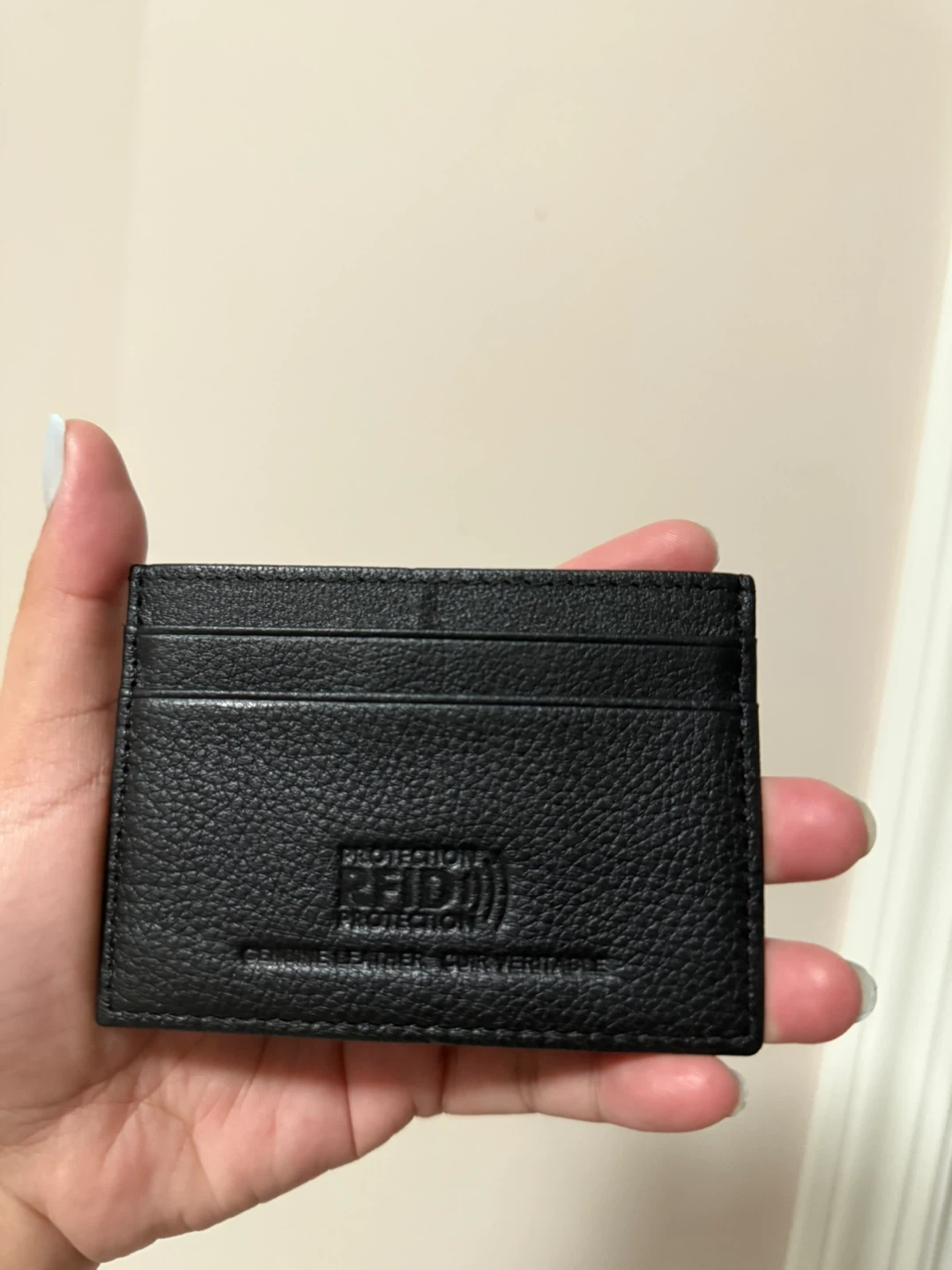 This card holder wallet is black and made from genuine leather. It has a clear ID window and multiple card slots. RFID protection is included.