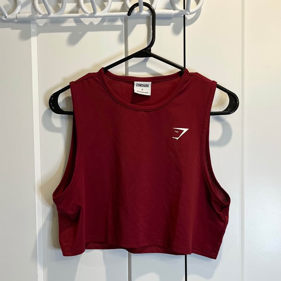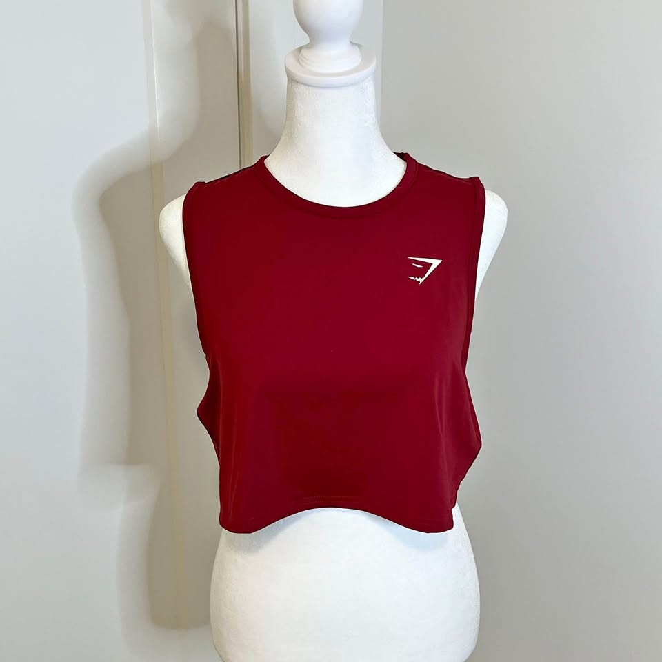 Gymshark women’s jersey style crop top. Deep red colour. High, round neckline. Relaxed fit. Size S.
