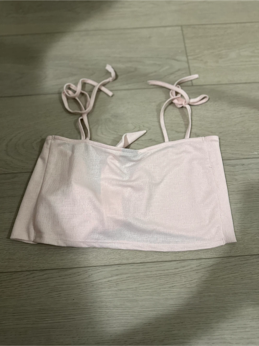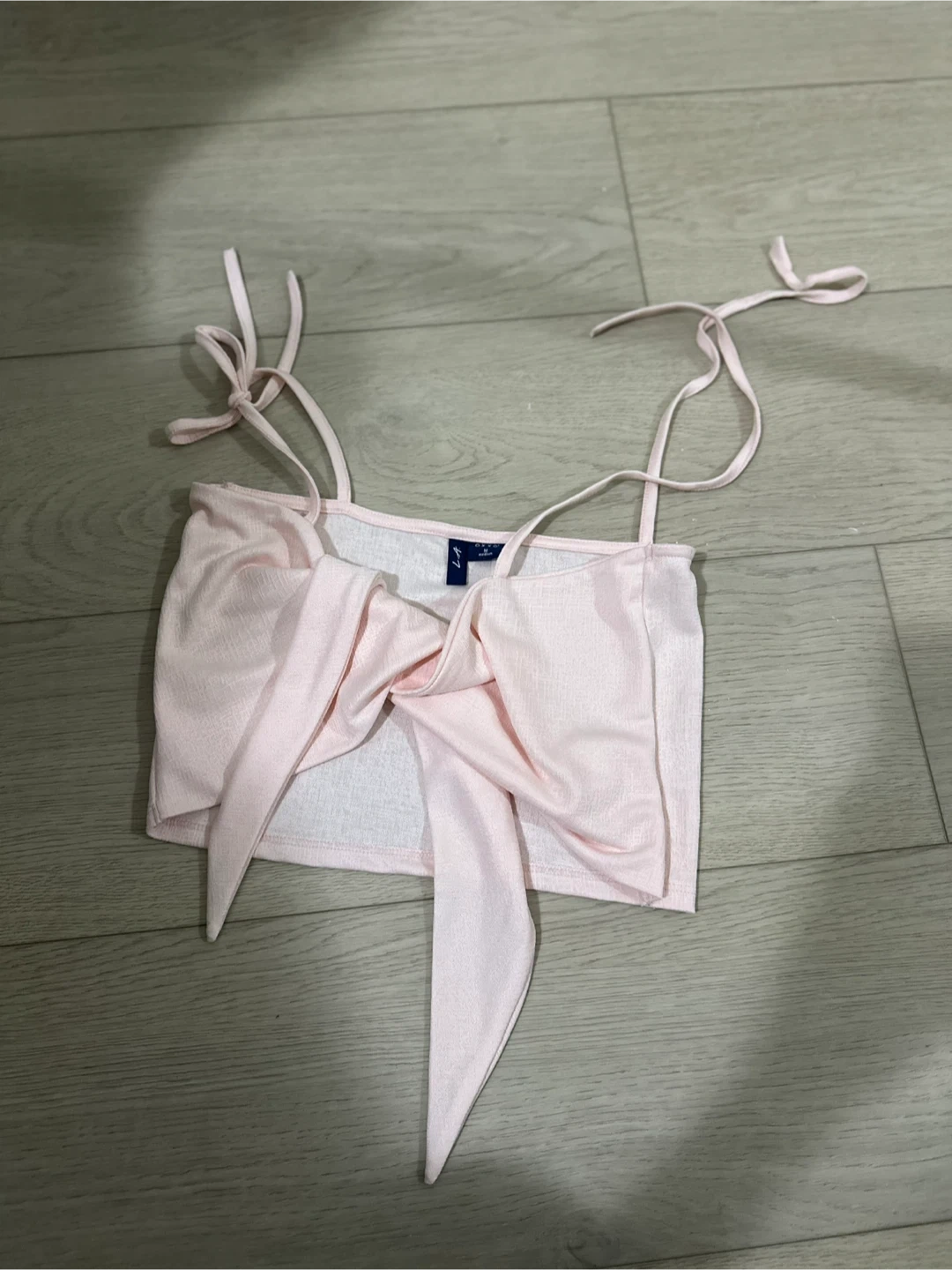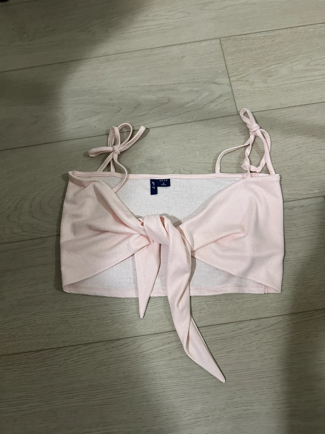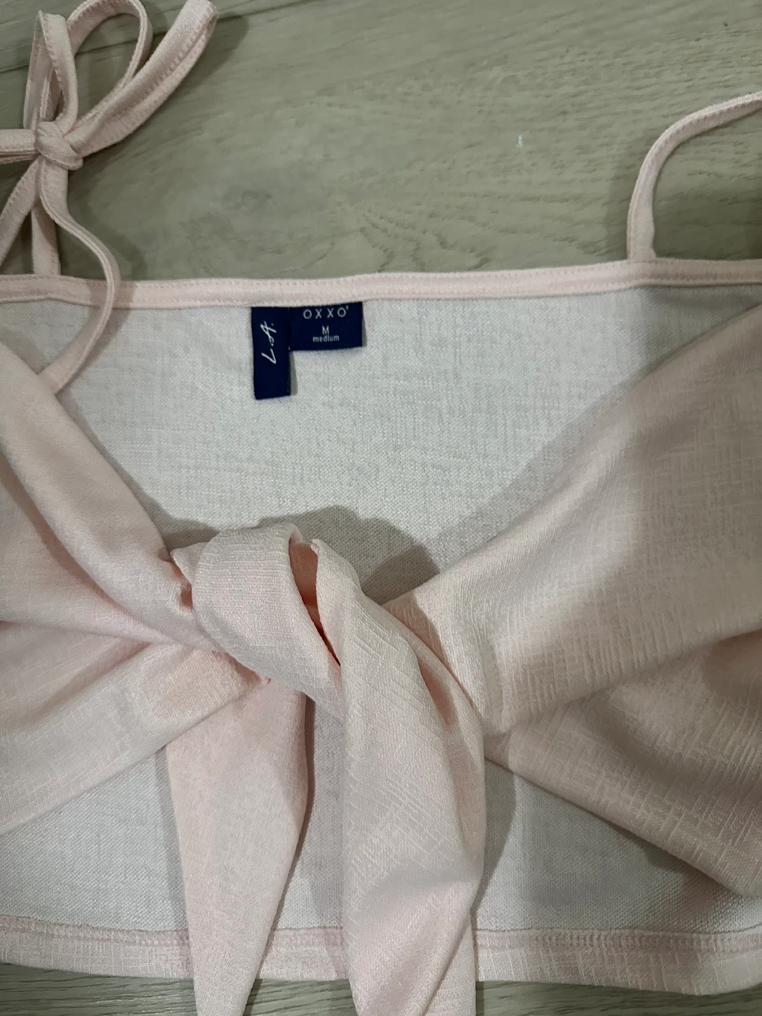 Here's a cute light pink tie front top from OXXO! It's a size medium and would be a great addition to your wardrobe for the warmer weather