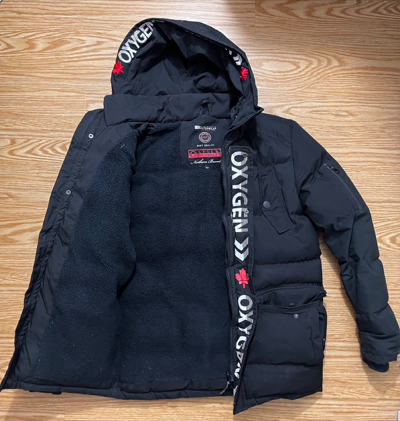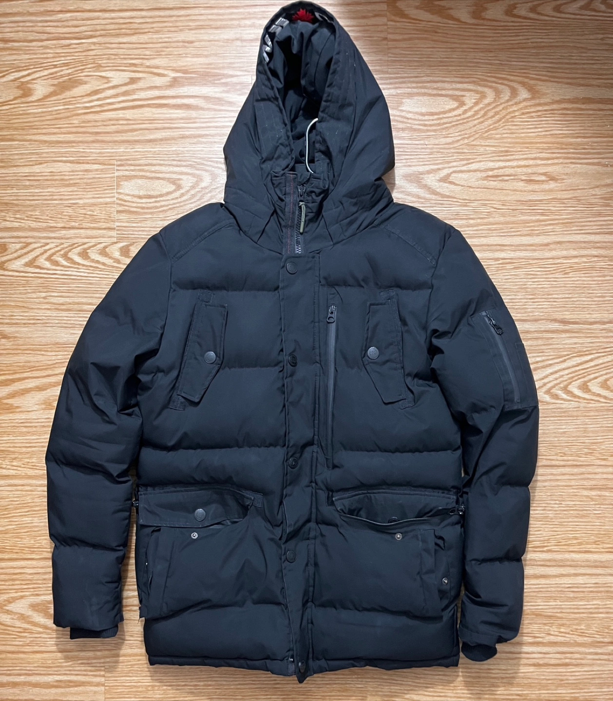 65Warm winter jacket. Black colour. Multiple pockets. Fleece-lined hood. Great for cold weather. Size 4.