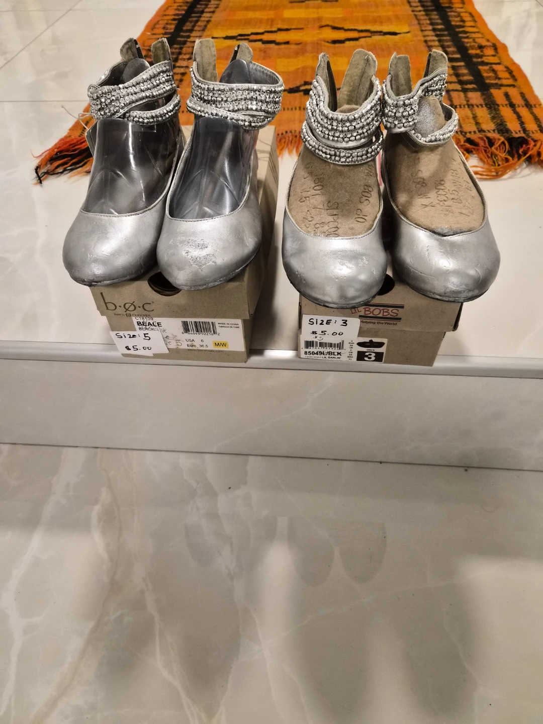 Selling two pairs of silver shoes. One pair is size 5 and the other is size 3. They come with their original boxes!