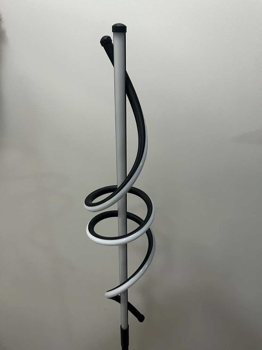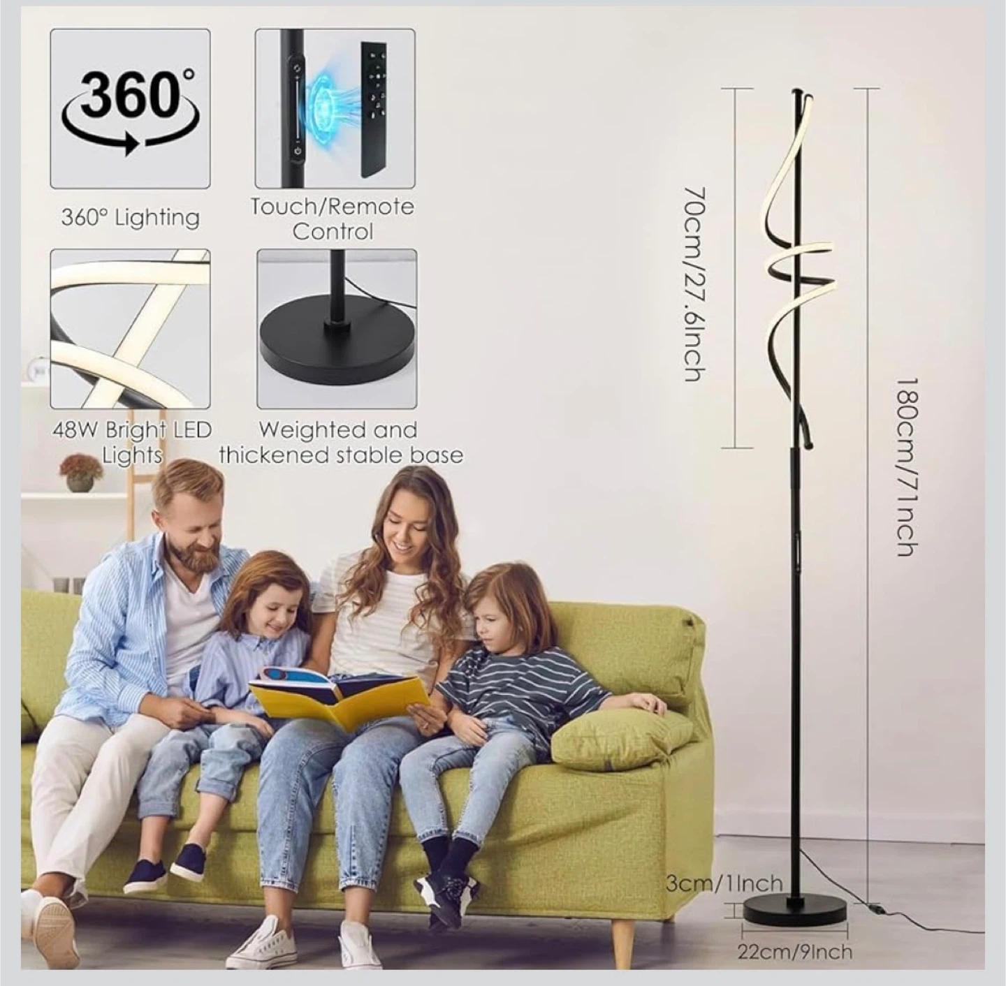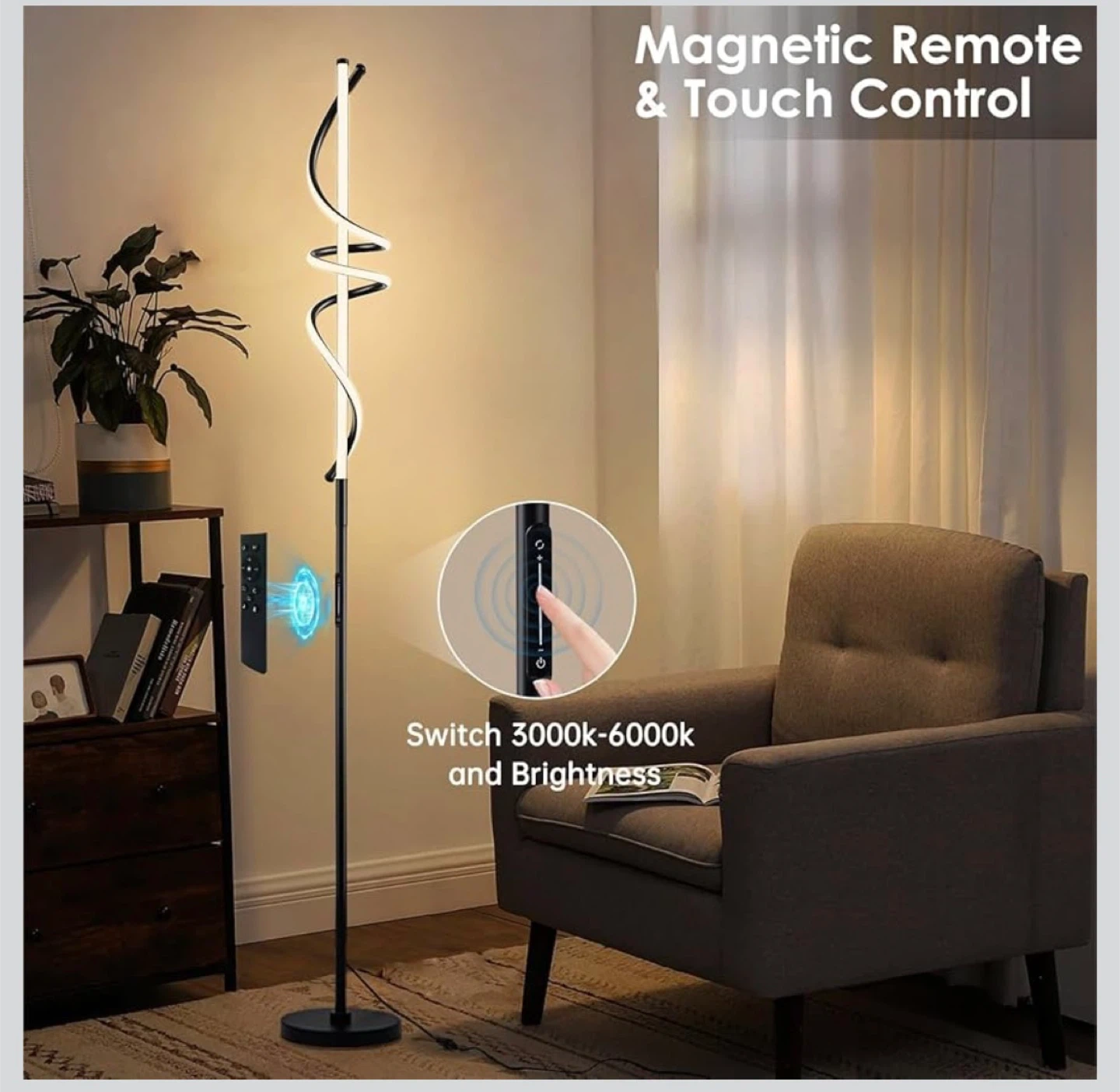 This modern floor lamp features a unique spiral design and provides 48W bright LED lighting. It offers 3 color temperatures (3000K, 4500K, 6000K) and stepless dimming, all controllable via touch or remote. The lamp has a weighted base for stability. It's perfect for adding ambient lighting to any room.