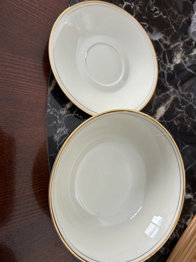Beautiful 20-piece vintage Ivory China dinnerware set, service for 4. This set features a classic, elegant design with delicate gold-rimmed edges on a cream-colored porcelain base. Perfect for holiday hosting, special occasions, or as a timeless wedding/housewarming gift. Set Includes: 4 Dinner Plates, 4 Salad/Bread Plates, 4 Soup/Cereal Bowls, 4 Tea/Coffee Cups, 4 Saucers. Details: Material: Fine Ivory China. Design: Classic gold band trim. Origin: Made in China (Imported by Jesenige Enterprises). Care: Hand wash recommended to preserve the gold gilding. Cashless payment and cash accepted.