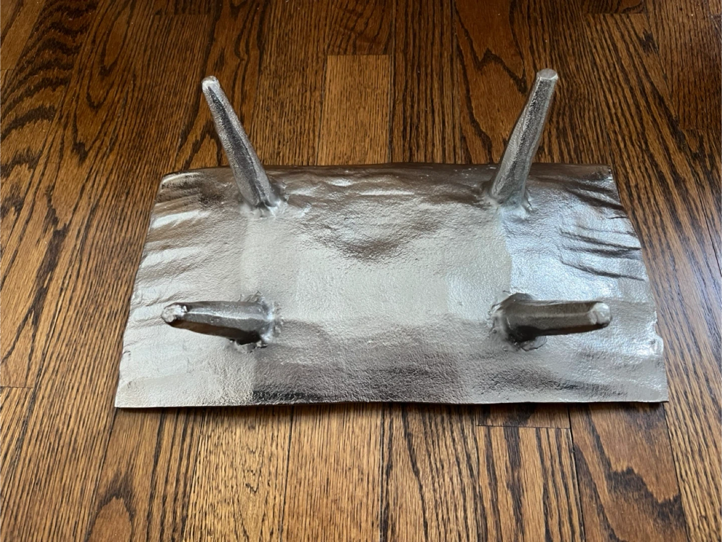 This decorative tray features a textured, wavy surface with raised edges and four sturdy feet. It's finished in a metallic silver colour. Perfect for serving appetizers or displaying small items!