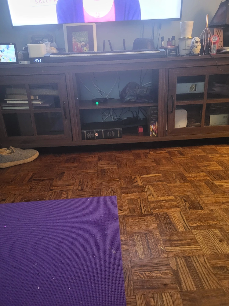 Selling a wooden TV stand. It's in great shape and has plenty of storage space with glass doors on either side and open shelving in the middle. Perfect for organizing your entertainment system!