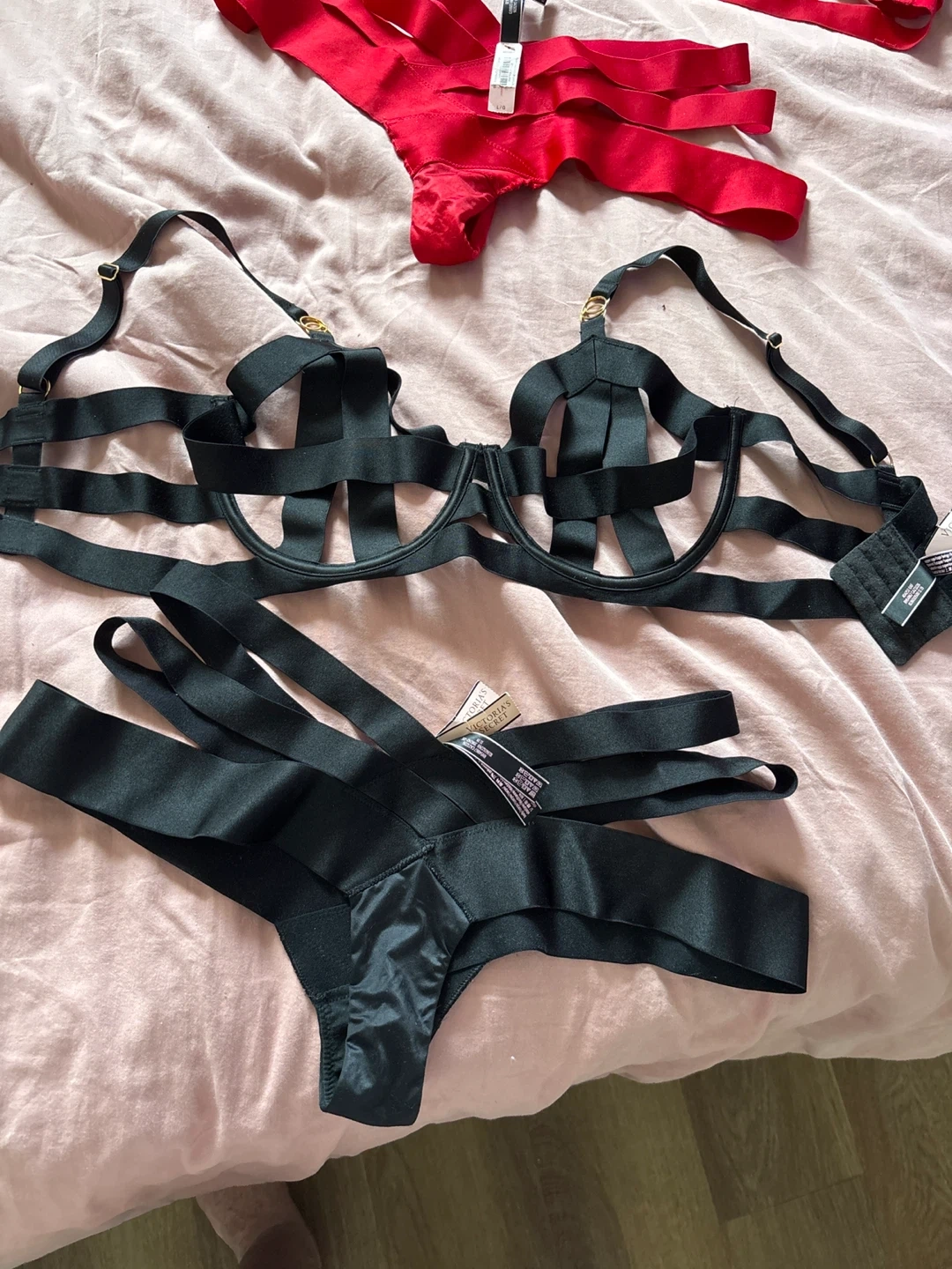 Victoria's Secret strappy bra and thong panty set in black. Includes original tags. This set features intricate strap detailing for a bold look. Great for adding a stylish touch to your lingerie collection! Never worn …
