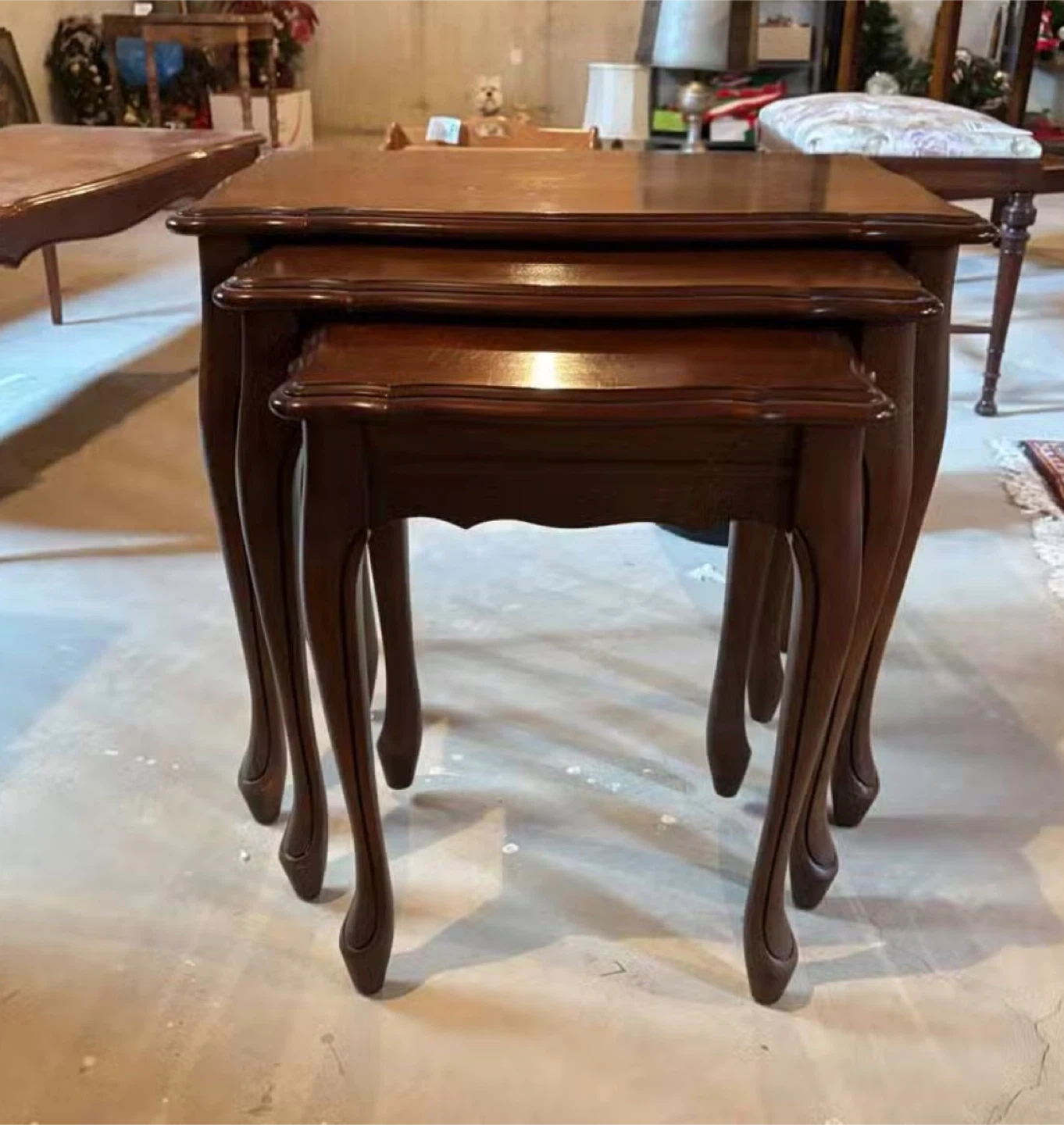 Set of three nesting tables in a rich, dark wood finish. These tables are perfect for saving space when not in use. Their elegant design and curved legs add a touch of classic style to any room. Wood material.
