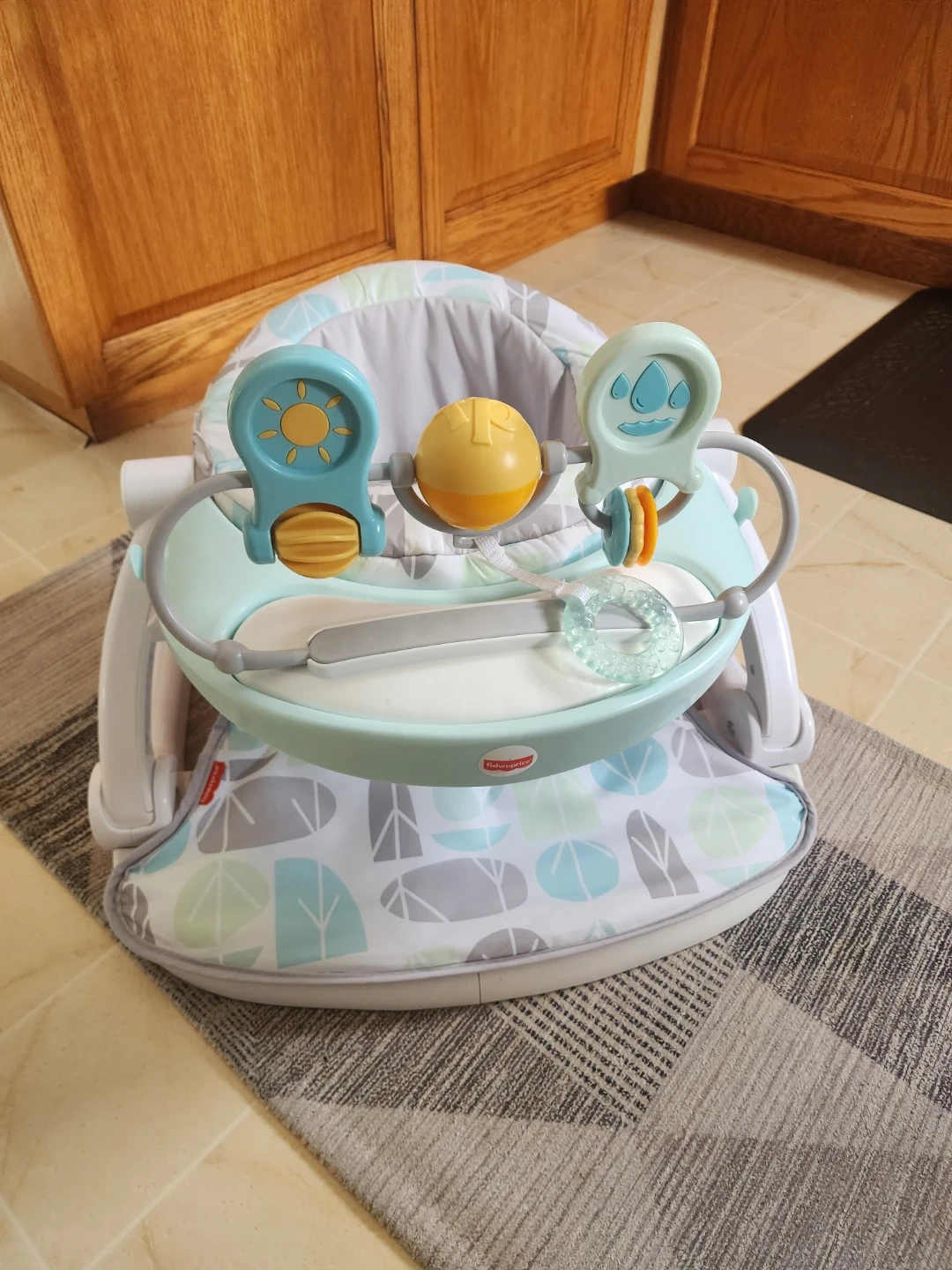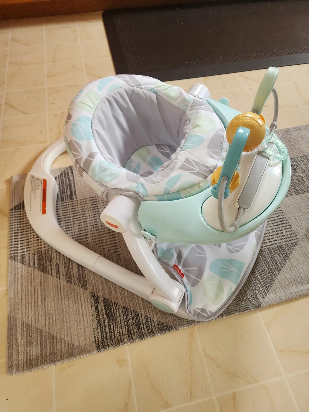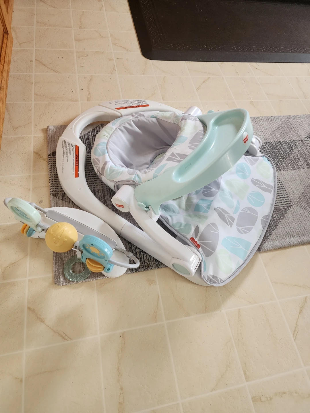 The seat easily folds flat for storage. Fabric portion comes off for washing. Removable toys and tray. Smoke free home.
