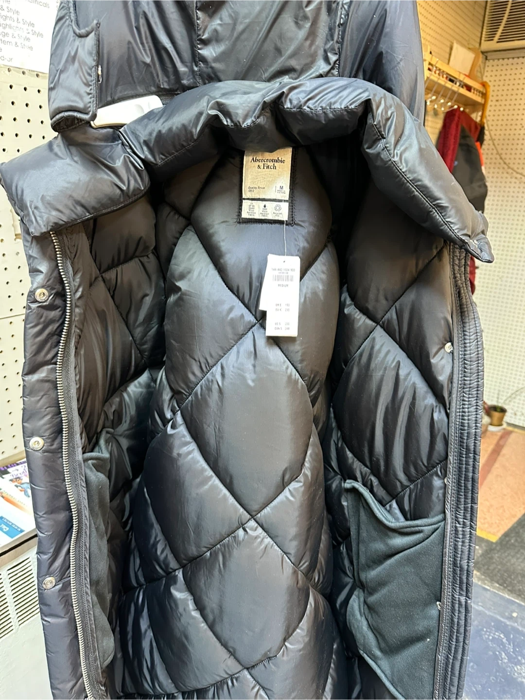 Here's a stylish black puffer coat from Abercrombie & Fitch! It's a size medium and features a quilted lining to keep you warm and cozy on those chilly days