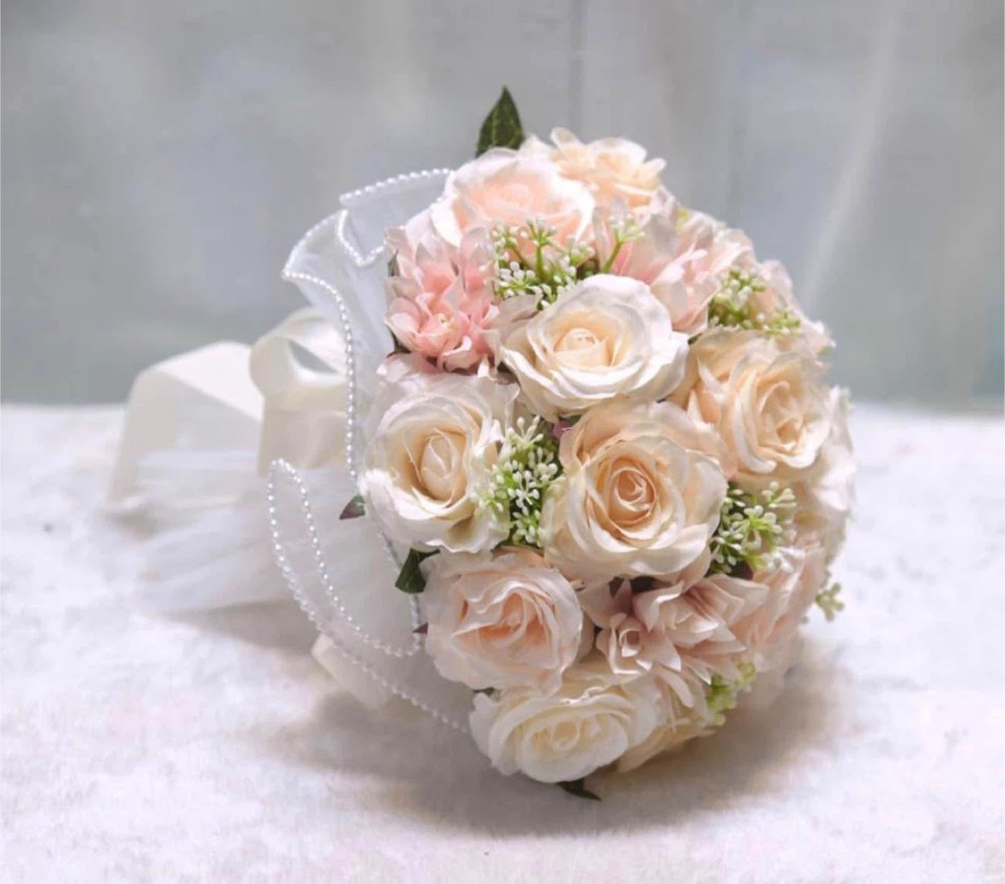 Beautiful artificial wedding bouquet featuring cream and blush roses with delicate filler flowers. It's elegantly wrapped with a sheer ribbon and pearl trim. This bouquet is perfect for a bride or for decorative purposes.