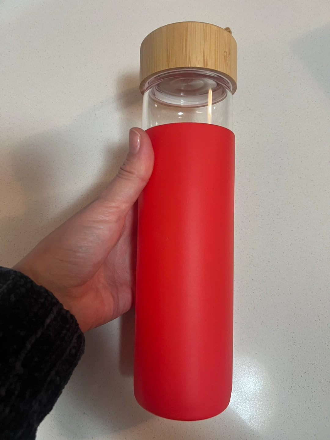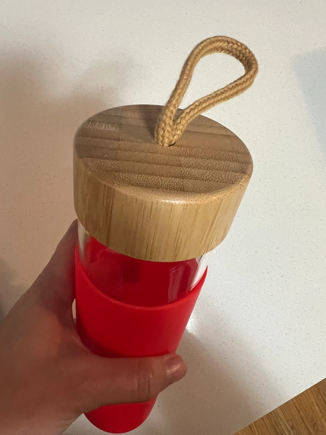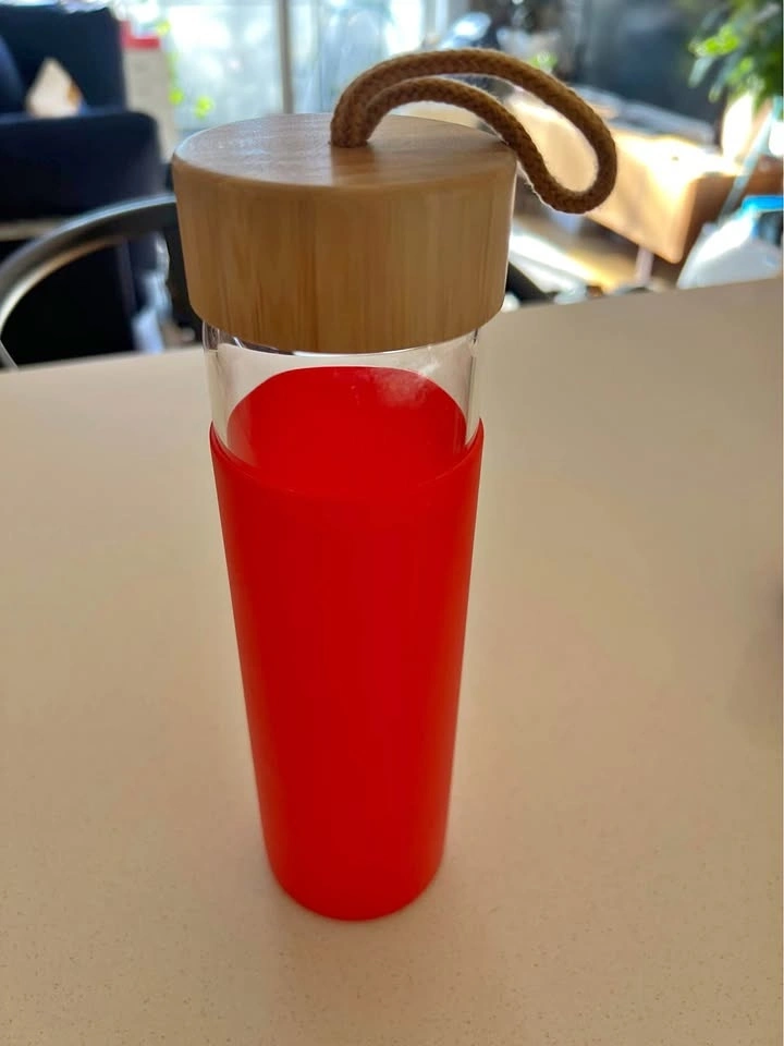 Brand new glass water bottle with silicone cover and bamboo/metal lid with carry strap.